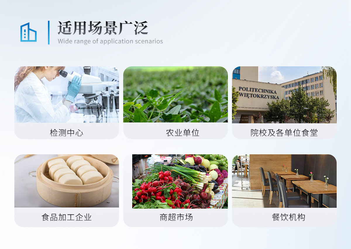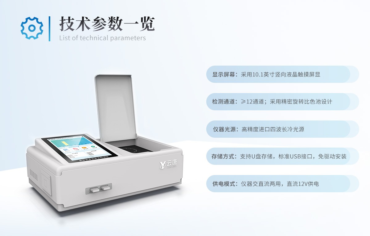 | 儀器采用臺式一體化系統檢測技術,將分光光度模塊、新型農殘檢測模塊、數字化管理模塊、無線通訊模塊高度集成于一體,支持檢測200種食品安全檢測項目,同時預留升級檢測方法。 | 儀器檢測模塊標準化、智能化,可隨意自由組合。檢測箱體內置多個標準檢測單元,檢測模塊可以調整配置。 | 儀器采用全新安卓智能系統,主控芯片采用 ARM Cortex-A7,RK3288/4核處理器,10.1寸高清液晶觸摸豎屏,更加**的UI交互界面,運轉快捷;儀器配備無線通信模塊: 4G(APN)通訊模塊、Wifi模塊,藍牙傳輸,同時具有雙USB接口以及RJ45接口能以多種方式實現數據保存和數據傳輸功能。 | 創新檢測模式: | ★檢測通道:≥12通道;采用精密旋轉比色池設計,使用同芯片同光源校準精度,解決不同光源之間的誤差值。1-12通道間誤差0.1%。(***:**202022821055.2) | ★儀器具有自動識別比色皿檢測功能,即:將樣品比色皿放入儀器后,點擊樣品檢測,儀器自動識別比色皿進行通道檢測。 | 進口高精光源: | 高精度進口四波長冷光源,通道配置 410、520、590、630nm 波長光源,一個光源芯片驅動一個光源,誤差極小,每臺設備單獨**校準光源,**比對,同時參照四種不同波段光源全方位覆蓋市面上99%的農殘食品項目檢測。 | 智能化操作系統: | 便捷操作系統:設備檢測時可在同一檢測界面自動對應相關檢測通道一次性選擇1-12個樣品名稱,無須退出界面,節省操作時間。 | 數據集成系統:設備首頁自動統計檢測數據包含:周檢測數據、月檢測數據,全部檢測總數量,均包含檢測總數,合格數,不合格數,以及相關柱形分析圖,對各項檢測數據清晰掌握,無需電腦查詢,更加快捷直觀。 | 項目預設系統:支持添加單個及多個相同或不相同的任務預設,一鍵快速調取,每一個任務分別可以設置不同的樣品、批次、編號、來源、備注、抽樣信息、檢測信息、受檢信息、復核信息等更多信息。無縫鏈接平臺和APP實時查看下發任務。 | 數據監管系統:同步對接監管平臺,數據可局域網和互聯網數據上傳,檢測結果可選擇直接傳至食品安全監管平臺。集成OSS輸出存儲服務、區分設備定向管理應用,進行區域食品安全監管及大數據分析處理與數據統計,檢測區域食品安全長短期動態,達到食品安全問題預估、預警。 | 自定義打印系統:內置全新打印系統,新創自定義打印方式,可按需靈活設置開啟或關閉:產品合格證(國家農業部標準要求),二維碼,抽樣信息、檢測信息,受檢信息、復核信息、抽樣日期、檢測日期等信息的打印。 | 系統遠程更新功能:可定向分客戶分儀器更新系統,按照不同客戶后期實際需求添加項目,無需機器返廠,即可遠程實時升級全新系統,節省時間成本及避免運輸造成設備損壞。 | 儀器主機采用一體化防水、抗壓、防撞擊、防腐蝕箱體設計,同時配備交直流供電,可連接車載電源,可選配大容量充電鋰電池,滿足現場野外檢測需求。 | 安全證書,放心保障:儀器具有中國計量科學研究院校準證書,權威認證。 |