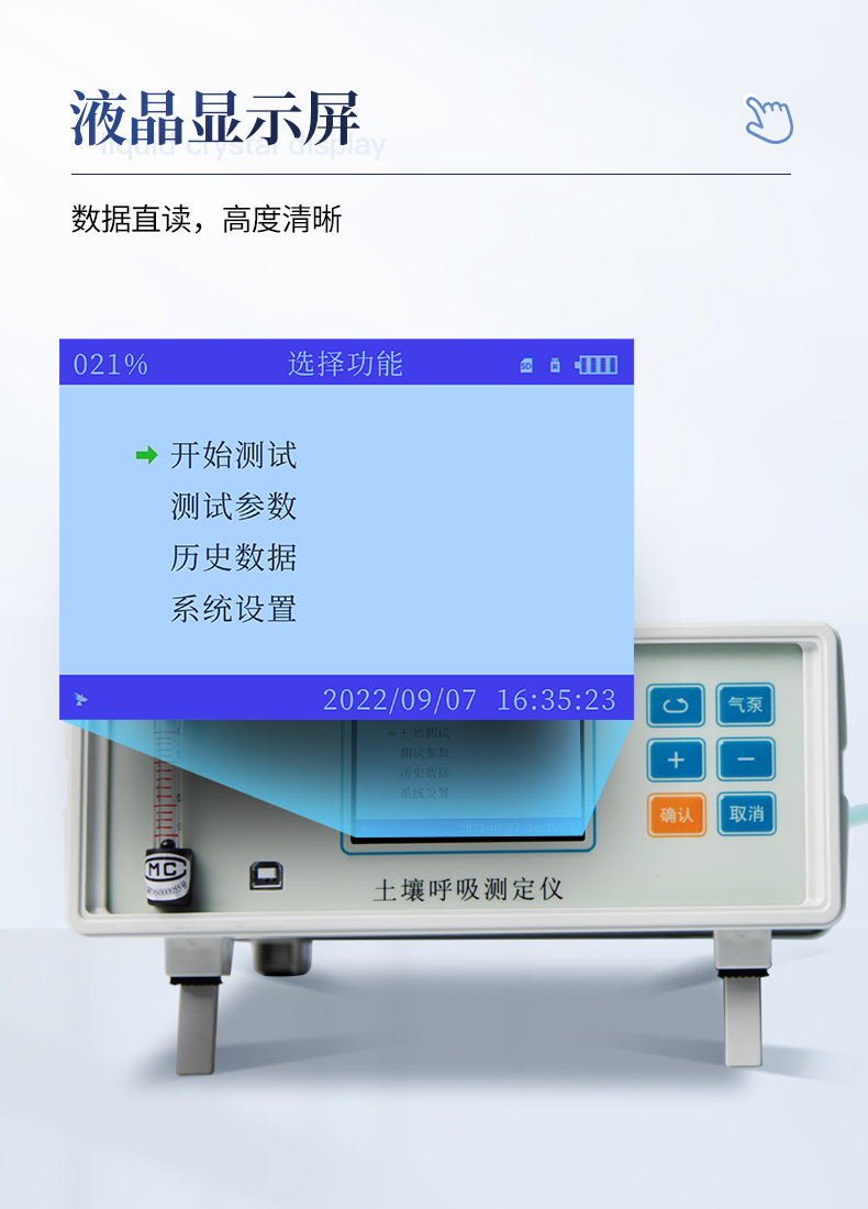 | CO2分析: | 加入了溫度調節的雙波長紅外二氧化碳分析器, 測量范圍:0-5000ppm,分辨率:0.1ppm; 精度3ppm。二氧化碳測量不受溫度變化影響,具有穩定、精度高,反映靈敏,1秒鐘之內就可以完成二氧化碳差值采集。 | 溫度:德國賀利氏高精度數字溫度傳感器,測量范圍:-20-80℃,分辨率:0.1℃,誤差±0.2℃ | 濕度: 瑞士進口高精度數字濕度傳感器,測量范圍0-85%,分辨率:0.1%,誤差≤ 1% | 光合有效輻射:帶有修正濾光片的硅光電池,測量范圍:0-3000μmolm ㎡/秒 ,精度<1μmolm> | 流量測量:玻璃轉子流量計,流量在0-1.5L范圍內任意設定, 誤 差:1%,在0.2~1L/ min范圍內精度<±0.2%。可選配微型電子流量計,微型電子流量計,流量在0-1l范圍內任意設定。分辨率:0.0001l<> | 呼吸室尺寸:直徑110mm, 高200mm,其他尺寸呼吸室可定制。 | 操作環境:溫度-20℃—60℃,相對濕度:0-85%(沒有水汽凝結) | 電源:DC8.4V鋰電池,可連續工作10小時 | 數據存儲:內存16G,可擴展為32G。 | 數據傳輸:USB連接電腦可直接導出數據。 | 顯 示:3.5"TFT真彩液晶屏彩色顯示器 | 分辨率 800×480,強光下清晰可見 。 | 按 鍵:六按鍵,操作簡單方便 | 體積:260×260×130mm | 重量:主機3.25kg | 可選配:土壤水分溫度傳感器 |