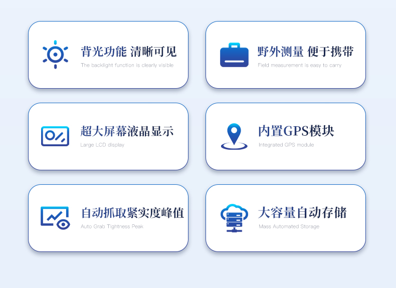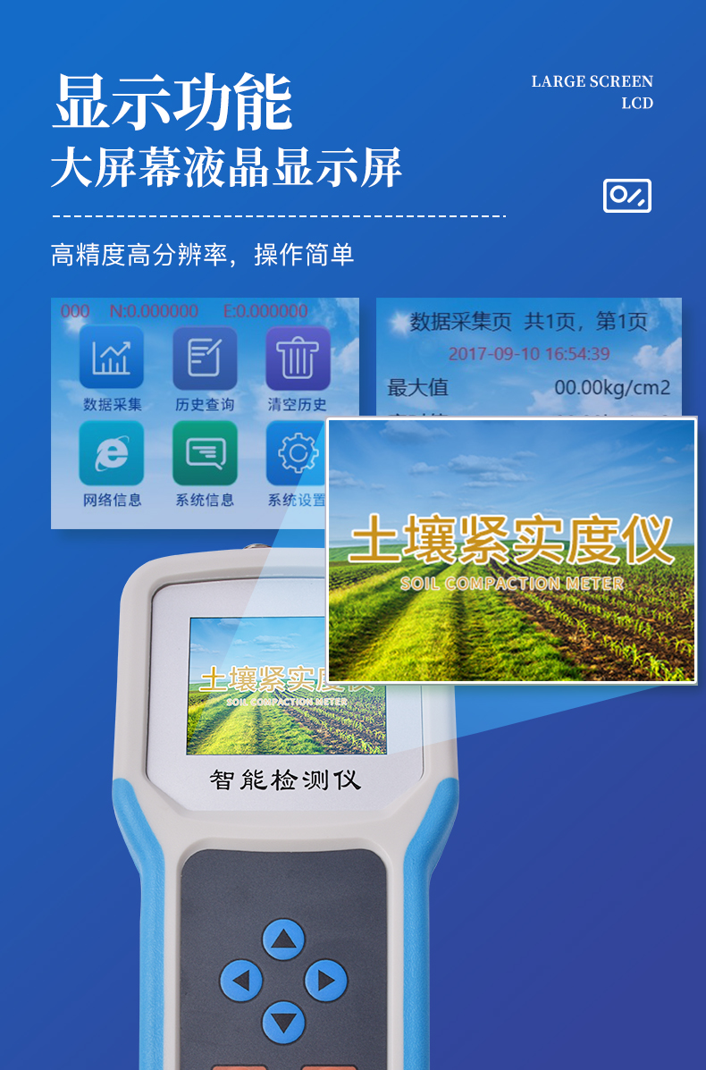 | 野外便攜式,高精度高分辨率,具有操作簡單,功能全、攜帶方便等特點。 | 可直接測量土壤緊實度,內置GPS定位及深度測量系統,可顯示測量點的位置信息(經緯度)測量深度及土壤緊實度,并且可以隨時將測量時每次采樣的數據存儲到主機上,*多可以儲存200個測量點的所有數據。 | 具有數據上傳功能:利用RS232接口與計算機連接,利用軟件可自動生成每個測量點的土壤緊實度曲線并且可由多個測量點生成區域性土壤緊實度分布圖并自動生成相關數據鏈。軟件具有存儲、打印功能。 | 具有自動抓取土壤緊實度峰值及背光燈功能,綠色環保,自動關機功能。 | (在無操作顯示器按鍵情況下,10分鐘后顯示器自動關機)。 |