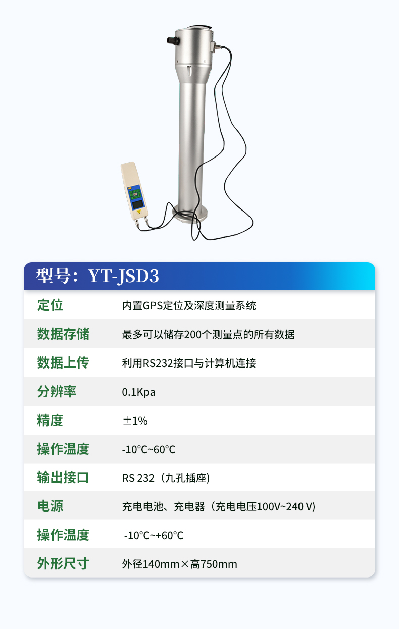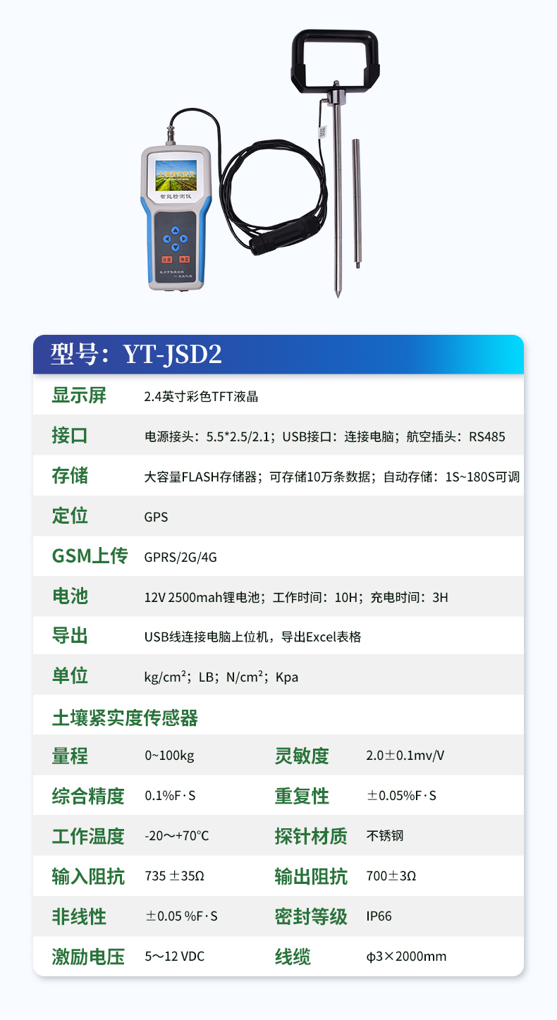 YT-JSD3數顯土壤緊實度測量儀也被稱作土壤堅實度和硬度測量儀,可用于野外測量土壤的緊實度,內置GPS定位及深度測量系統,可同時顯示土壤緊實度,測量深度及地理位置,與計算機連接后可自動生成每個測量點的土壤緊實度曲線并且可由多個測量點生成區域性土壤緊實度分布圖并且自動生成相關數據鏈。