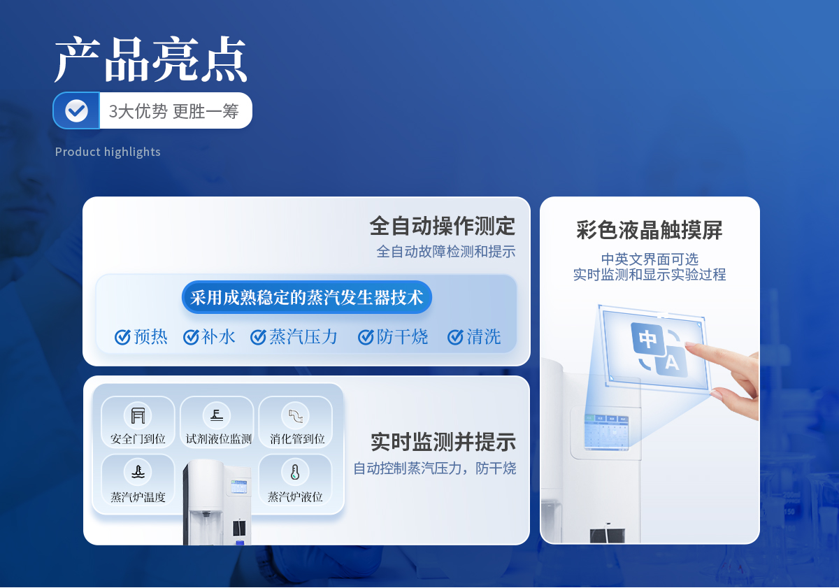 | 1. 采用國家標準的凱氏定氮方法,濃硫酸環境消解樣品、堿性環境蒸汽蒸餾、硼酸吸收、指示劑滴定終點顏色判斷法。并參與國家標準GB/T22923-2008、官方JJF109-2012《定氮儀校準規范》的起草; | 1. ☆全自動添加試劑、全自動蒸餾滴定、滴定杯全自動排廢清洗、全自動校正、全自動故障檢測、全自動溶液液位監測、全自動計算、數據存儲、測試報告生成; | 2. 彩色液晶觸摸屏,蒸餾時間與試劑添加通過屏幕設定,條件可自動保存; | 3. 滴定顏色可自動與手動校準。滴定終點判定采用高精度的十六位三基色數字信號顏色傳感器采集顏色信號。 | 4. 2.0μL的高精度滴定系統,專業的一體式精工柱塞。確保測試精度和使用的可靠性。 | 5. 彩色液晶觸摸屏,中英文操作界面可選,實時監測和顯示實驗過程,條件可自動保存; | 6. 可存儲完整的測試數據1000組; | 7. 全自動故障檢測和提示:安全門、消化管到位監測和提示,試劑液位監測和提示,蒸汽爐液位和溫度檢測和提示; | 8. 采用成熟穩定的蒸汽發生器技術,自動預熱、補水,自動控制蒸汽壓力,自動防干燒,自動清洗; | 9. 自動控制蒸汽壓力在安全范圍之內,遠離蒸汽過壓危險; | 10.雙蒸餾模式,手動與自動任意切換; | 11.☆堿泵采用高可靠的聚四氟乙烯風箱泵,專用防腐蝕,耐顆粒堵塞,加液穩定,負壓抽吸無危險; | 12.節水設計,冷卻水流量1.5L/min, 冷卻水只在蒸餾過程開啟,冷卻水流量實時監控,低水壓報警顯示,停水自動終止運行; | 13.貼合氨逸出規律特殊設計的蒸餾系統,確保高可靠的測試回收率; | 14.消化管周邊設施智能化設計,透明亞克力保護罩,將危險徹底隔離; | 15.蒸汽發生器具有壓力傳感器、溫度傳感器、溫度保護開關、水位雙重檢測等多重保護; | 16.儀器具備自檢功能、具備一鍵重置。 | 17.☆試劑桶液位監測,保證實驗過程不出現缺液問題。 | 18.☆高分子材料防濺瓶設計。 |