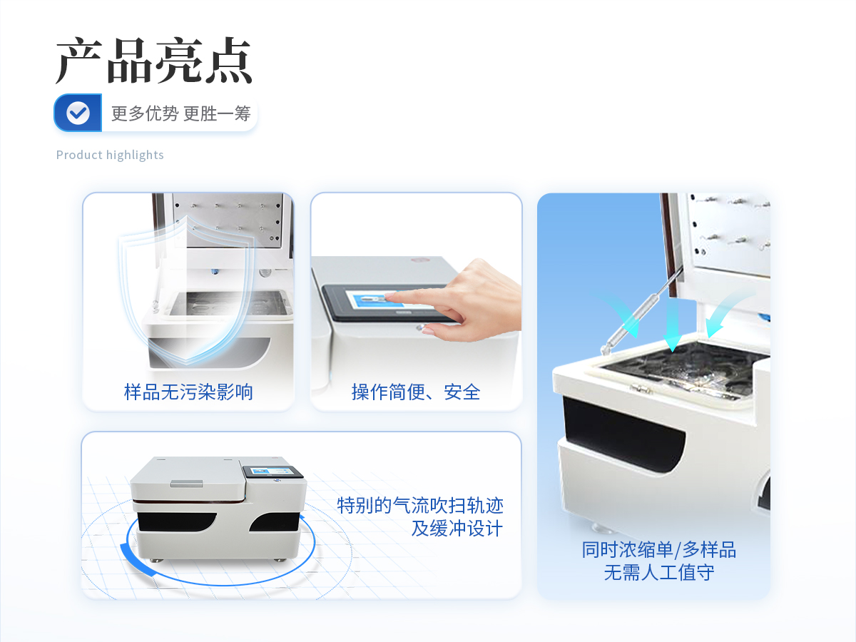 全自動多功能干式氮吹儀YT-QD12G是我司結(jié)合實驗室使用需求,從使用者方便安全快捷穩(wěn)定等多角度共同開發(fā)的新型濃縮定容產(chǎn)品,產(chǎn)品擺脫了常規(guī)市場上利用水浴加熱揮發(fā)而導(dǎo)致樣品進行污染的弊端,確定樣品的安全性與準確性,具有無人值守、準確定容、大批量濃縮的特點,可多組數(shù)據(jù)儲存功能,實現(xiàn)了全自動化的定量及批量濃縮,濃縮全程,讓繁瑣的濃縮過程變得靈活、省心、**和安全。