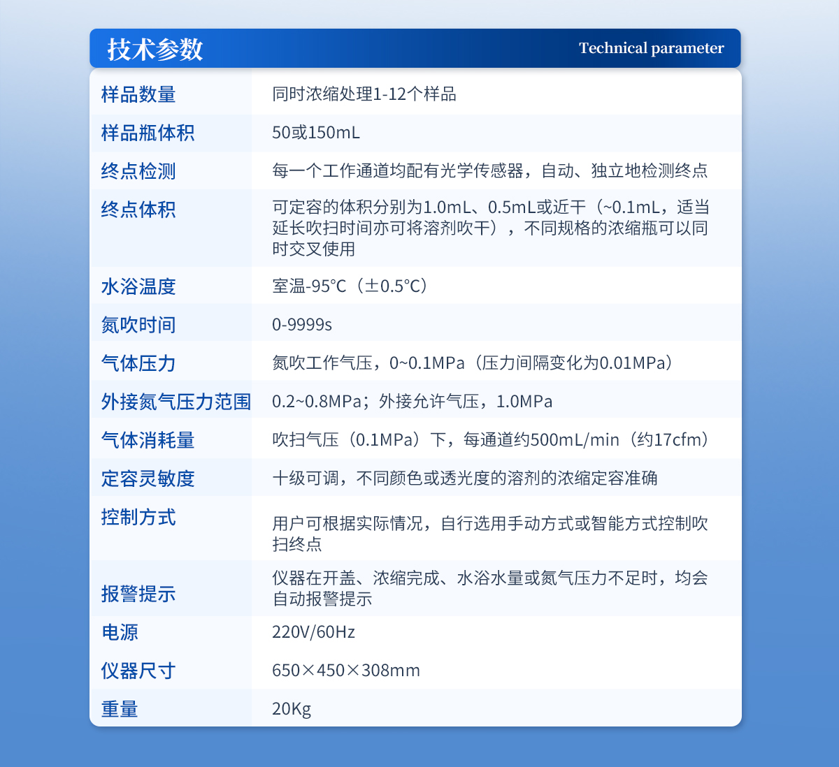 | 1、 樣品數(shù)量:可同時濃縮處理1~12個樣品; | 2、 濃縮瓶容積:100ml或150ml | 3、 終點檢測:每一個工作通道均配有光學(xué)化感器,自動、獨自檢測終點,無需人工看管; | 4、終點體積:自動感應(yīng)的定容體積人別為1.0ml、0.5ml或近干(約0.1ml,定容規(guī)格選配),適當延長時間亦可將溶劑吹干,不同規(guī)格的濃縮瓶可以同時交叉使用; | 5、工作參數(shù)任意設(shè)置、控制和實時顯示:主要工作參數(shù),溫度、氮吹時間和氣體壓力; | 6、溫度設(shè)定:室溫~95℃(±0.5℃); | 7、氮吹時間:0~9999sec; | 8、氣體壓力:氮吹工作吹掃氣壓,0~0.50mpa范圍內(nèi)任意設(shè)定,儀器自帶自動調(diào)壓裝置,可自動調(diào)節(jié)至所設(shè)定的吹掃壓力并保持恒定,不受工作通道(樣品)突然開啟、關(guān)閉或數(shù)量的影響;外接氮氣壓力(氮氣鋼瓶分壓表壓力)范圍:0.10~0.50mpa;外接極限氣體壓力:0.7mpa; | 9、氣體消耗量:吹掃壓力(0.10mpa)下,每通道約500ml/min(約17cfm); | 10、定容靈敏度:十級可調(diào),不同顏色或透光度的溶劑的濃縮定容準確; | 11、控制方式:用戶可根據(jù)實際情況,自行選用手動方式或智能方式控制吹掃終點; | 12、報警提示:儀器在開蓋、濃縮完成、氮氣壓力不足時,均會顯示; | 13、儀器運行中途開蓋,自動智能記憶工作狀態(tài),儀器繼續(xù)執(zhí)行之前被中止的程序,無需重新設(shè)置工作參數(shù)及工作通道; | 14、所有橡膠配件均采用無增塑劑的硅膠制造,避免樣品收到來自儀器的污染; | 15、靈活的工作參數(shù)設(shè)定、方便的樣品置入/取出過程,免去繁瑣的準備工作,減低了有機溶劑對操作人員的毒害; | 16、密閉式結(jié)構(gòu)設(shè)計及自帶的強力排風(fēng)系統(tǒng)可將有機揮發(fā)成份和水蒸氣集體統(tǒng)一排出,避免了有機溶劑在實驗操作空間的揮發(fā)擴散,保障了操作人員的身體健康,并避免了對壞境的污染; | 17、儀器利用干式加熱方式,方便了用戶更換加熱用水; | 18、輸入電源:220V/60Hz; | 19、儀器重量:20kg |