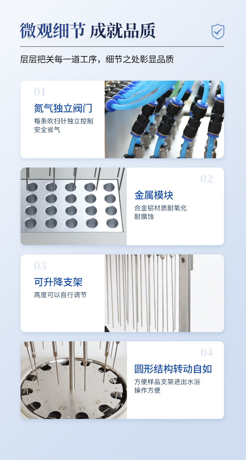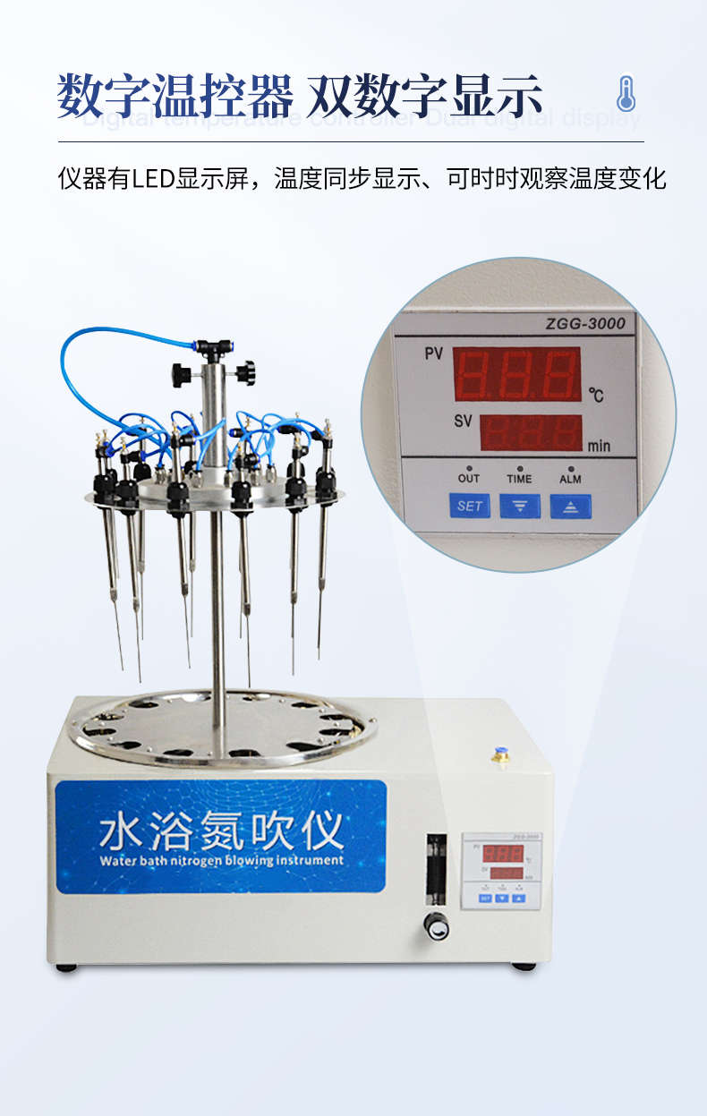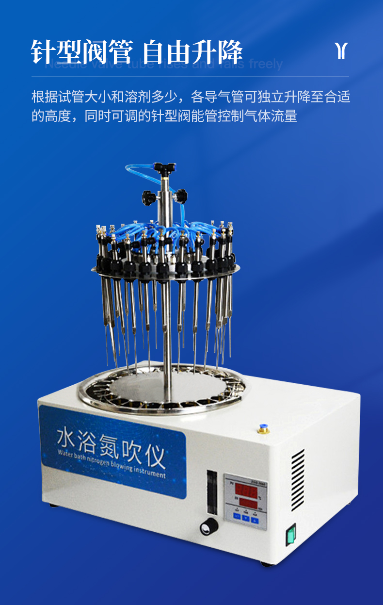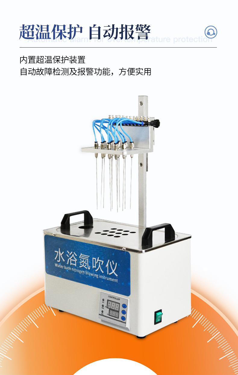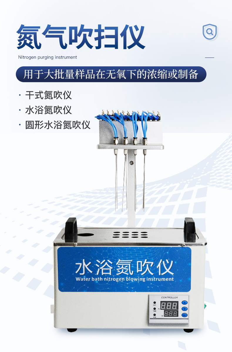 水浴氮吹儀采用吹掃捕集技術,同時可對樣品進行控溫加熱,利用氮氣等惰性氣體快速、可控、連續地吹到樣品表面來達到樣品溶液快速無氧濃縮。該方法具有省時、便捷、準確的特點。廣泛用于食品安全、醫藥、農藥殘留檢測、臨床藥代等領域。