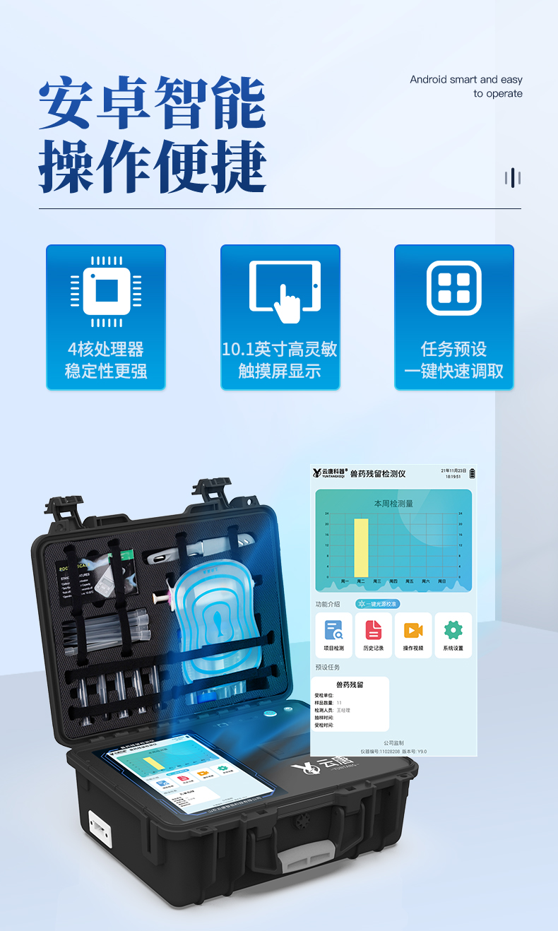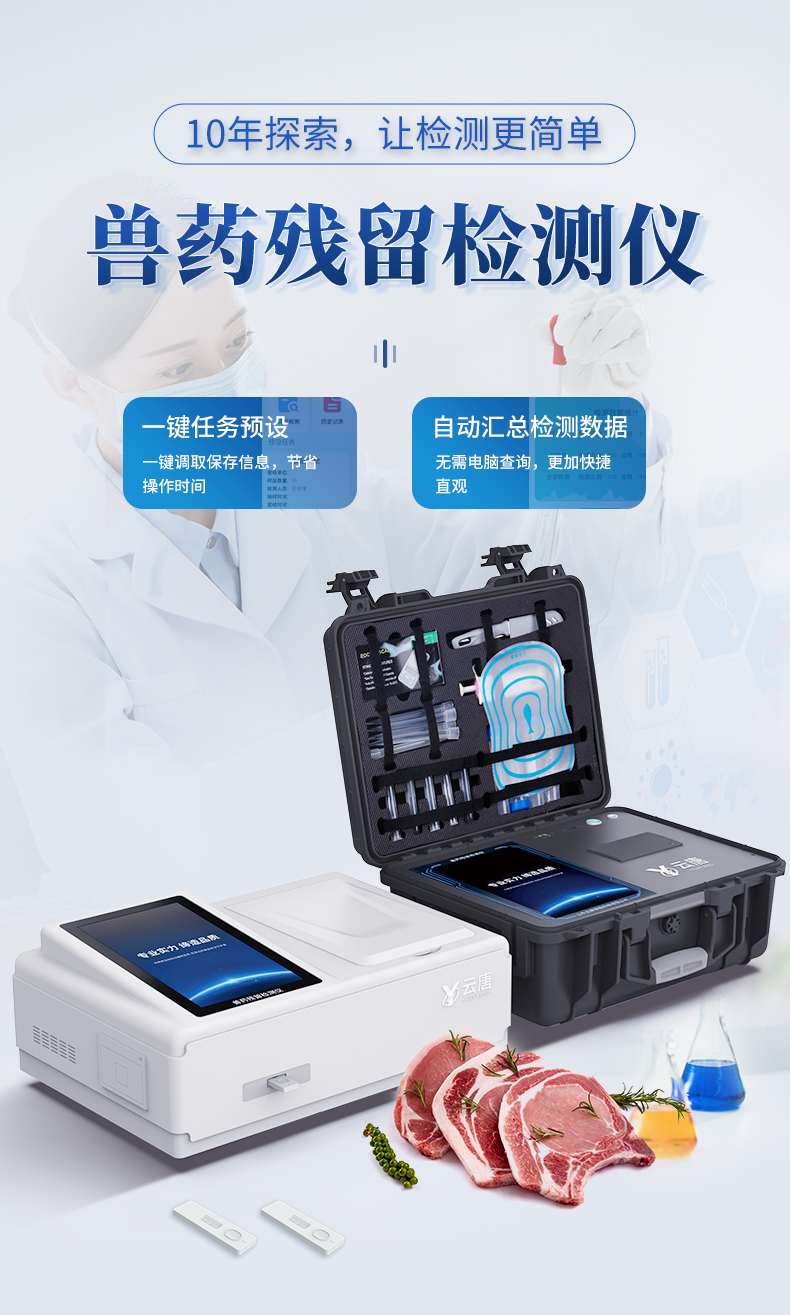 山東云唐智能科技有限公司生產的農獸藥殘留檢測儀,采用手提箱式一體化設計,可快速檢測幾十種項目,包含各種蔬菜水果中有機磷和氨基甲酸酯類農藥殘留;各種肉食品中瘦肉精激素類殘留,抗生素殘留,獸藥殘留,水產品藥物殘留等現場的定性定量檢測。