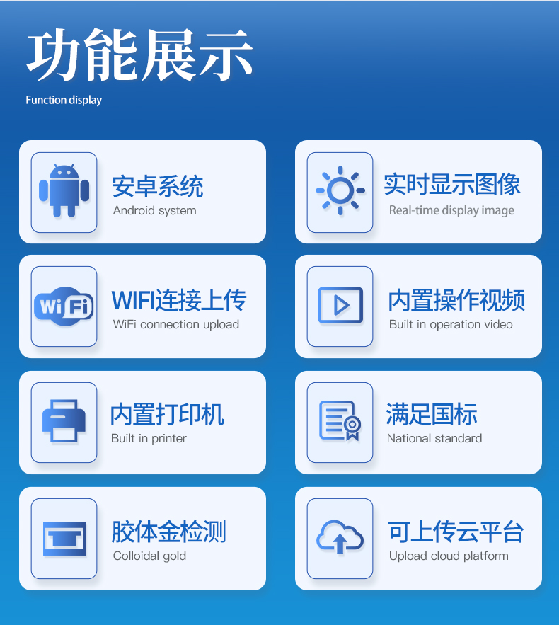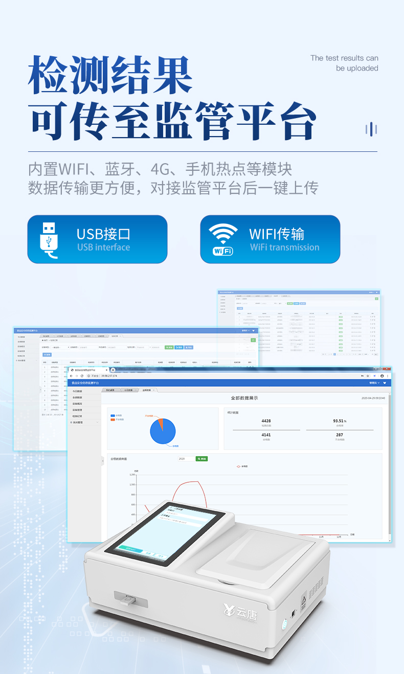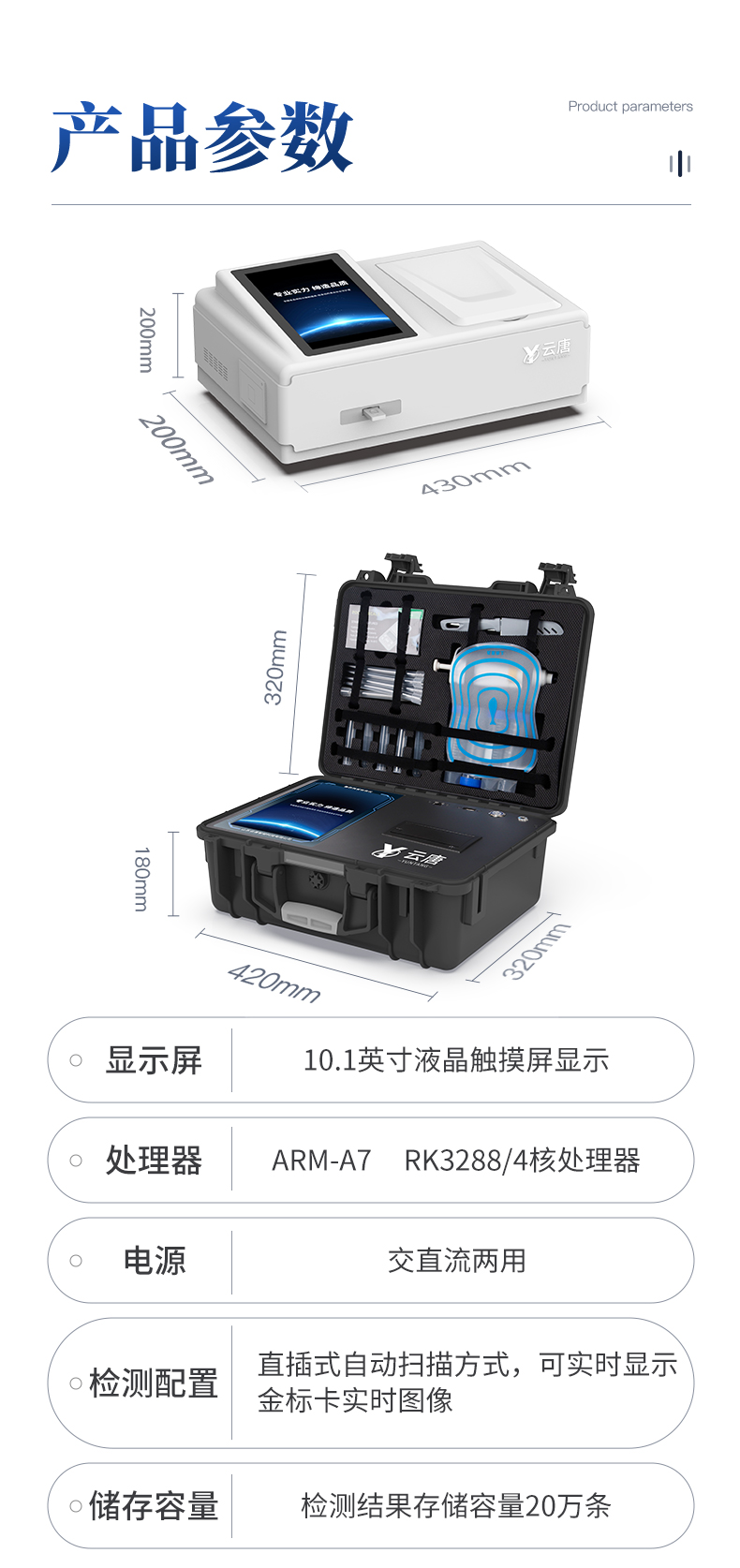 | 儀器采用臺式一體化系統檢測技術,將分光光度模塊、膠體金檢測模塊、新型農殘檢測模塊、數字化管理模塊、無線通訊模塊高度集成于一體,支持檢測200種食品安全檢測項目,同時預留升級檢測方法。 | 儀器檢測模塊標準化、智能化,檢測項目可隨意自由組合。檢測臺式體內置多個標準檢測單元,檢測模塊可以調整配置。 | 顯示屏幕:儀器采用10.1英寸豎向液晶觸摸屏顯,搭配運行安卓智能操作系統,主控芯片采用ARM Cortex-A7,RK3288/4核處理器,主頻1.88Ghz,操作方便,性能更強。 | 檢測通道:≥12通道;采用精密旋轉比色池設計,使用同芯片同光源校準精度,解決不同光源之間的誤差值,更加準確**。(1-12通道間誤差0.1%,***:**202022821055.2) | 儀器光源:高精度進口四波長冷光源,每個通道均配置 410、520、590、630nm 波長光源,標配**的光路切換裝置,專利光路切換功能可實現64波長,并且所有檢測項目可實現所有通道同時檢測。 | 設備可一鍵校準,自動保存校準數據,自動對比校驗,得到精準光源,采用Android SP存儲數據,光源數據永不丟失,方便每一次使用。 | 通訊接口:配備無線通信模塊、4G(APN)通訊模塊、藍牙傳輸,同時具有雙USB接口以及RJ45網線接口,可以多方式實現數據保存及數據傳輸。 | 存儲方式:支持U盤存儲,標準USB接口,免驅動安裝。檢測結果存儲容量20萬條以上,可生成Excel表格進行拷貝,并具有登錄保護功能。 | 智能化操作系統: | 1、操作系統:儀器可在同一檢測界面自動對應相關檢測通道,一次性選擇1-12個樣品名稱,無需退出界面,節省操作時間。并可以對每個通道屬性和樣品信息單獨進行編輯,例如送檢單位、人員,檢測人員等,打印時勾選打印顯示。 | 2、數據集成系統:設備首頁自動匯總分析檢測數據,包含:周檢測數據、月檢測數據,全部檢測總數量,包含檢測總數,合格數,不合格數,以及相關柱形分析圖,各項檢測數據一目了然,無需電腦查詢,更加快捷直觀。 | 3、數據庫系統:十幾項數據庫分類管理儀器:包含項目類型、項目數據、檢測數據、歷史記錄、國標信息、曲線信息、采樣信息、檢測信息、受檢信息、復核信息、圖表信息、光源校準信息、打印樣式信息、樣品庫信息等等,數據庫之間互相協調聯動保證數據的真實完整性。同時產品數據庫以及歷史檢測記錄支持一鍵檢索功能。 | 4、限量規判系統:具有限量查詢、添加物質合規判定系統。檢測出結果后,系統自動調用系統數據庫中相關國標進行比對判定,客觀顯示判定結果是否合格。 | 5、項目預設系統:儀器具有任務預設模塊,一鍵提前預設,給出方便快捷的新檢測方案,每一個任務分別可以設置不同的樣品、批次、編號、來源、備注、抽樣信息、檢測信息、受檢信息、復核信息等更多信息。樣品送檢時一鍵調取保存信息,并可多次調取,大大提高檢測效率。 | 6、數據監管系統:同步對接監管平臺,數據可局域網和互聯網數據上傳,檢測結果可直接傳至食品安全監管平臺。進行區域食品安全監管及大數據分析處理與數據統計,監測區域食品安全長短期動態及問題預估、預警。 | 7.1、全新打印系統:內置全新打印機,新創自定義打印方式,可按需靈活勾選控制:產品合格證(國家農業部標準要求),二維碼,抽樣信息、檢測信息,受檢信息、復核信息、抽樣日期、檢測日期等信息的打印。 | 7.2、A4紙版本報告打印功能(可選配):設備擁有兩種結果展示方式,可以自動生成A4打印模板和小票打印模板兩種樣式,可通過WiFi及網線等方式鏈接外置打印機可進行打印。 | 供電模式:儀器交直流兩用,直流12V供電,可連接車載電源,配6ah大容量充電鋰電池,電量可實時顯示,方便戶外流動測試。 | 膠體金檢測模塊:采用CMOS成像處理技術及膠體金免疫層析技術,可讀取膠體金卡數據,自動采集、處理分析,將檢測結果顯示,并可根據參考限值自動判斷檢測結果,可檢測常見的獸藥殘留、生物毒素、抗生素、違禁添加物等。 | 1、探測技術:CMOS成像探測; | 2、檢測通道:1個通道; | 3、檢測方式:消線法和比色法; | 4、顯示模式:陰性或陽性; | 5、曲線形式:軌道式掃描方式,顯示金標卡圖像,實時生成、識別CT曲線圖,無需手動調整,完成檢測后自動退出檢測卡。兼容市場上其他金標卡,使用耗材不受限制。 | 儀器具備遠程升級功能,可定向分客戶分儀器更新,開機后自動更新,并可持續性免費更新系統版本,無需像傳統產品返廠更新,節省時間及人力成本并避免了物流運輸返廠升級導致設備損壞的潛在風險。 |