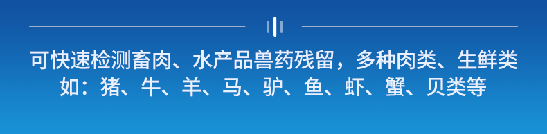 | 瘦肉精激素:鹽酸克倫特羅、沙丁胺醇、萊克多巴胺、己烯雌酚等 | 抗生素殘留:四環素類、硝基呋喃類、磺胺類、β-興奮劑類、沙星類、磺胺類、喹諾酮類,甲砜霉素,氟苯尼考,金剛烷胺、替米考星、慶大霉素、林可霉素、鏈霉素、恩諾沙星、環丙沙星、頭孢啦啶、青霉素、阿莫西林等 | 水產品安全類:孔雀石綠、氯霉素、呋喃妥因、呋喃西林、呋喃它酮、呋喃唑酮等 | 蛋類藥物殘留:氯霉素,四環素,磺胺類,喹諾酮類,呋喃西林,呋喃它酮,呋喃妥因,呋喃唑酮,氟苯尼考,阿莫西林、頭孢氨芐、紅霉素、鏈霉素等 | 動物疫病類:禽流感、新城疫、牛羊口蹄疫、牛羊結核病、牛羊包蟲、牛羊布病、小反芻獸、豬藍耳病毒、豬瘟病毒、豬偽狂犬病毒、豬細小、豬圓環、犬細小病毒、犬瘟熱病毒、犬狂犬病毒等 | 真菌毒素殘留:食用油、糧食及飼料中黃曲霉毒素B1、黃曲霉毒素總量,奶中黃曲霉毒素M1、嘔吐毒素、玉米赤霉烯酮、赭曲霉毒素A、T2毒素、伏馬毒素等 | 果蔬中:農藥殘留 |