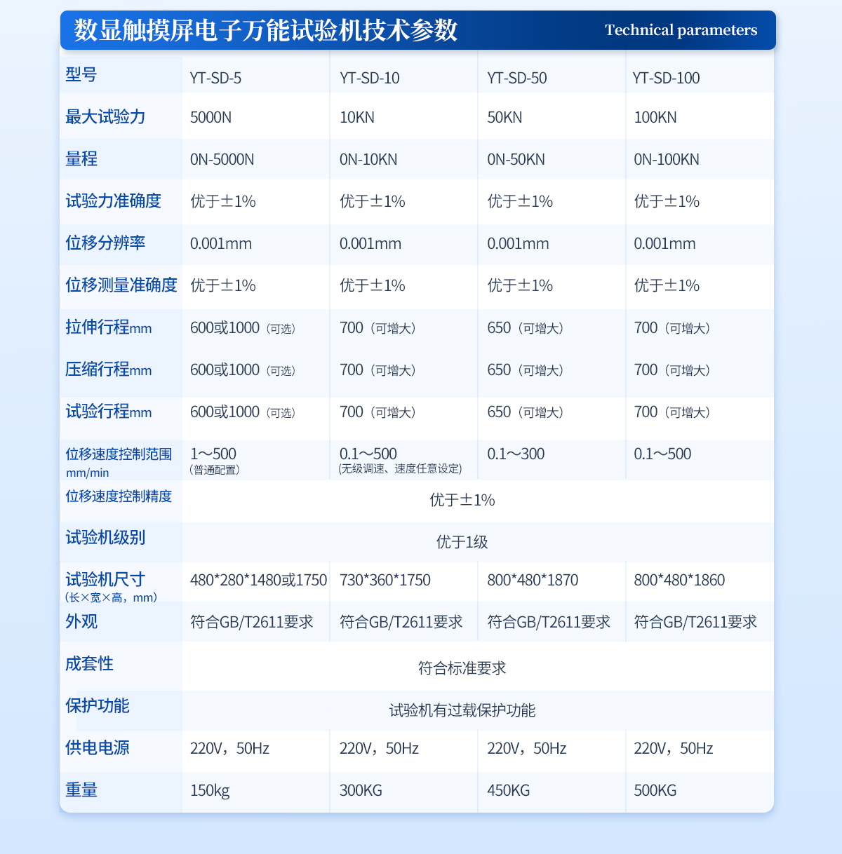 設定值<10%fs時,設定值的±1.0%以內>設定值≥10%FS時,設定值的±0.5%以內 | 10、變形速率控制精度: 速率<0.05%fs時為±2.0%設定值內> | 11、速率≥0.05%FS時為±0.5%設定值內 | 12、試驗空間: A.拉伸空間:600mm 壓縮空間:700mm | 13、夾具形式:楔形夾具體(可選液壓加緊) | 14、壓盤尺寸:φ100 mm | 15、整機電源:單相,220V±10%,50Hz,功率:3kW | 16、主機尺寸:1130×750×2650mm | 17、重量:1600 kg |