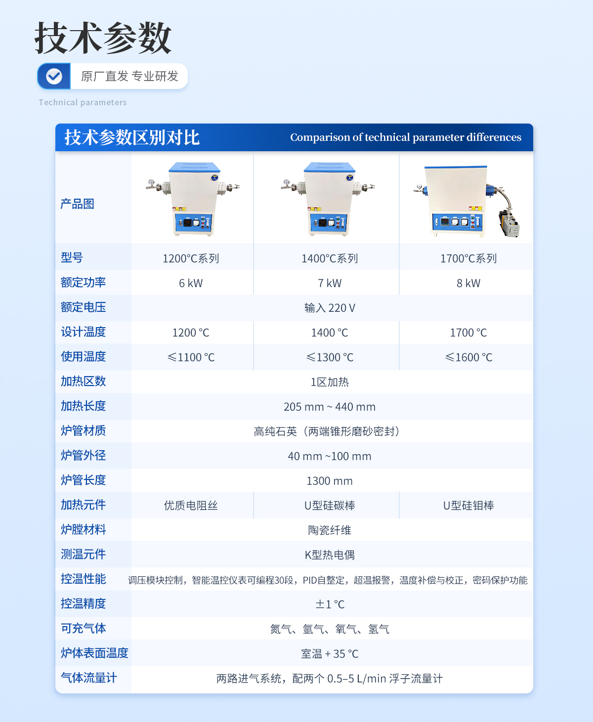 | **溫度:1700℃ | 常用使用溫度:1550℃以下 | 加熱元件:硅鉬棒 | 加熱方式:雙面加熱 | 熱電偶:B 型 | 控溫**度:±1℃ | 工作電壓:220V/8KW | 外觀設(shè)計(jì):電爐采用人性化設(shè)計(jì),美觀大方,操作簡單,外層漆層使用噴塑高 溫烘烤工藝。有耐高溫耐氧化,耐酸堿能力。 | 殼體設(shè)計(jì):電爐殼體采用雙層強(qiáng)制風(fēng)冷構(gòu)造,使電爐在高溫度時(shí)爐殼外部溫度 接近室溫,避免了意外傷害發(fā)生。 | 爐膛結(jié)構(gòu):一體化緊湊設(shè)計(jì),臺(tái)階式拼接結(jié)構(gòu),符合力學(xué)定律,加熱時(shí)受力均 勻,保障了熱能不易散失,延長了爐膛使用壽命。 | 爐膛材質(zhì):爐膛材質(zhì)采用**的輕質(zhì)氧化鋁陶瓷纖維,具有保溫效果優(yōu)良,質(zhì)輕耐高溫,耐極冷極熱,不易裂縫,不易結(jié)晶,不易掉渣,不用擔(dān) 心污染所燒制產(chǎn)品。節(jié)能效果是老式電爐的 60%-80%。 | 溫度控制:采用國內(nèi)宇電儀表廠家的智能控溫儀表,可設(shè)定 30段智能可編程PID自整定,一鍵操作, 自動(dòng)升溫, 自動(dòng)降溫,無需守值,操作簡單方 便。 | 升溫速率:0--20℃/min 任意設(shè)定,建議≦10℃/min | 安全保護(hù):電爐采用集成化電路,模塊控制.(具有偏溫保護(hù)、超溫保護(hù)、斷偶 保護(hù)、超流保護(hù)、等保護(hù)功能)使電爐工作穩(wěn)定可靠安全。 | 可通氣體:所有惰性氣體,混合氣體,氮?dú)狻⒀鯕狻⒁谎趸肌鍤獾取?/td> | 氣體控制:進(jìn)氣端可設(shè)置 1 或多個(gè)進(jìn)氣口,每個(gè)進(jìn)氣口均設(shè)有針閥,連接真空表一個(gè)。出氣端連接出氣孔一個(gè),抽真孔一個(gè),所有孔均設(shè)針閥。 配備真空泵一臺(tái)。 | 密封方式:采用 304 不銹鋼法蘭,具有裝卸方便,抗氧化,抗酸堿,雙層密封,保證了密封性。 | 保修期:爐體保修一年(加熱體易損件除外),終身維護(hù) | 標(biāo)準(zhǔn)配件:真空泵一臺(tái)、坩堝勾 1 把,防高溫手套 1 雙,使用說明書 1 份,合 格證,保修卡。 | 產(chǎn)品認(rèn)證:本產(chǎn)品通過歐盟標(biāo)準(zhǔn) CE 認(rèn)證 ISO 9001:2015 質(zhì)量管理體系認(rèn)證 | 包裝:出口木箱包裝并且內(nèi)有發(fā)泡沫填充,塑料薄膜包裹爐體。 |