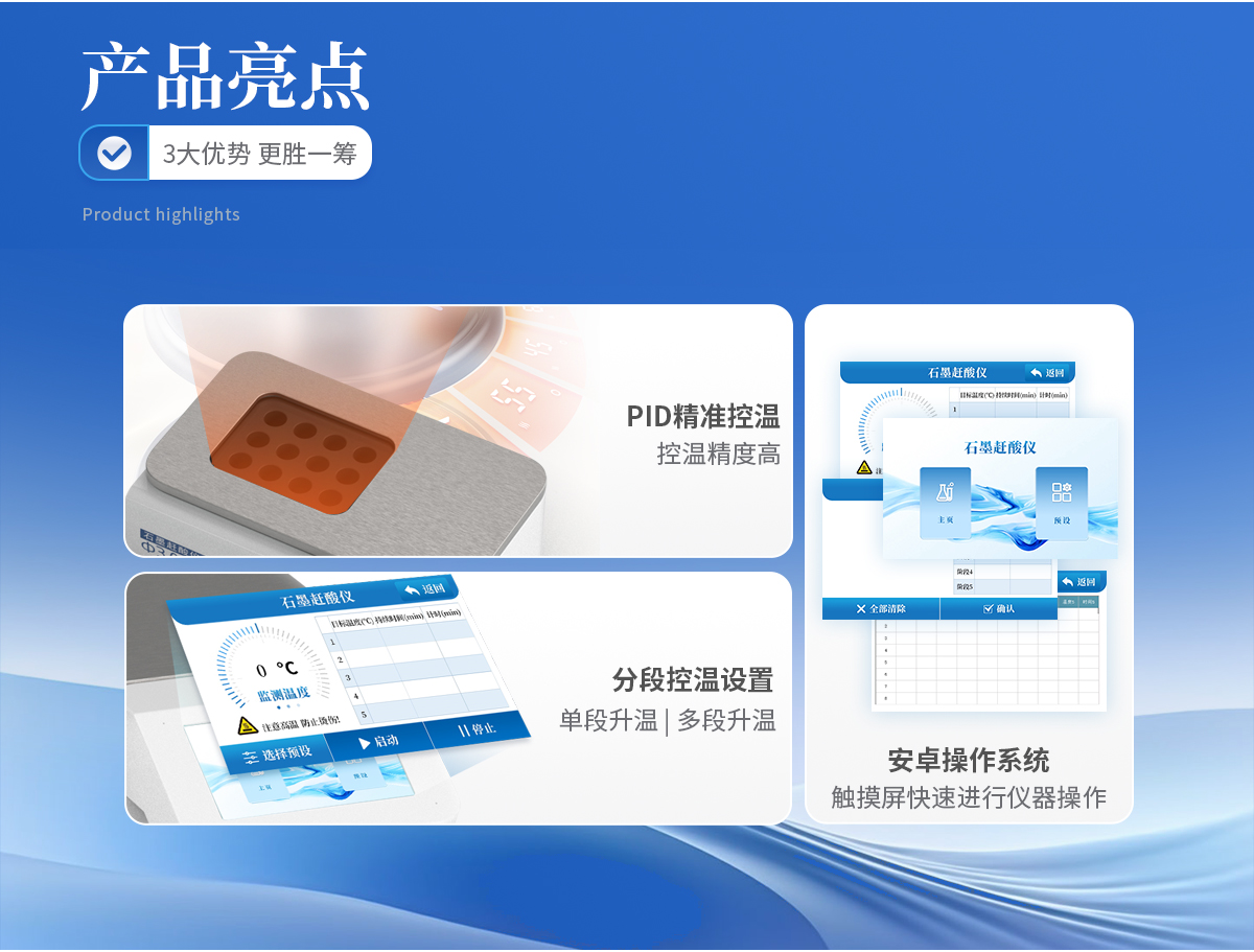 | 使用5寸彩色觸摸屏進(jìn)行儀器操作,配備安卓操作系統(tǒng),方便快捷。 | 采用PID 控溫技術(shù),控溫精度高,升溫速度快, 從室溫到260℃僅需25分鐘。 | 分段控溫設(shè)置,即可單段升溫,也可多段升溫,設(shè)置靈活,儀器將自動按順序完成。更適于易產(chǎn)生泡沫的樣品。 | 采用優(yōu)質(zhì)石墨爐內(nèi)芯,平均溫差較小,樣品效果一致性好,熱傳導(dǎo)效率更高。石墨塊具有特氟龍涂層,耐腐蝕,延長使用壽命。 |