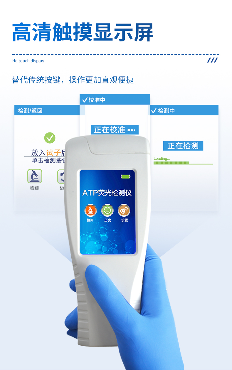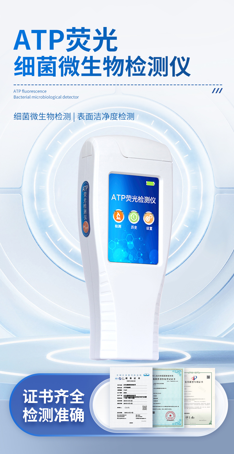 該儀器可快速檢測(cè)各種水質(zhì)中微生物、細(xì)菌含量。設(shè)備為全新升級(jí)產(chǎn)品,大屏幕觸摸顯示屏,代替?zhèn)鹘y(tǒng)按鍵。操作采用生物化學(xué)反應(yīng)方法檢測(cè)ATP含量,ATP熒光檢測(cè)儀基于螢火蟲發(fā)光原理,利用“熒光素酶—熒光素體系”快速檢測(cè)三磷酸腺苷(ATP)。ATP拭子含有可以裂解細(xì)胞膜的試劑,能將細(xì)胞內(nèi)ATP釋放出來,與試劑中含有的特異性酶發(fā)生反應(yīng),產(chǎn)生光,再用熒光照度計(jì)檢測(cè)發(fā)光值,微生物的數(shù)量與發(fā)光值成正比,由于所有生物活細(xì)胞中含有恒量的ATP,所以ATP含量可以清晰地表明樣品中微生物與其他生物殘余的多少,用于判斷衛(wèi)生狀況。
