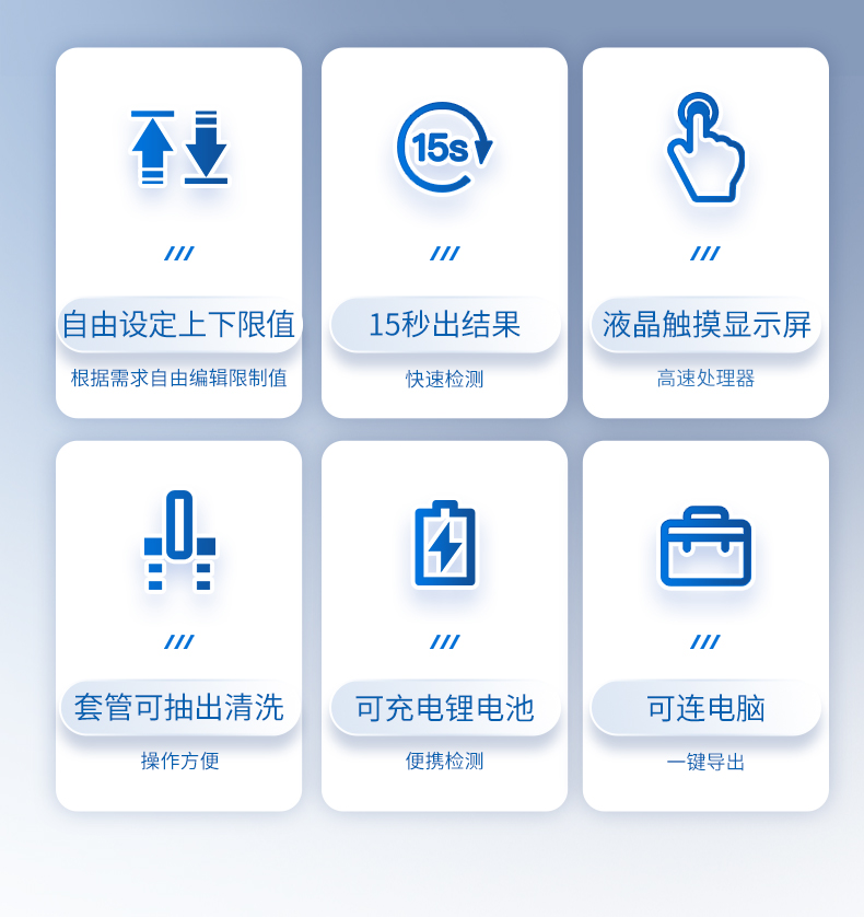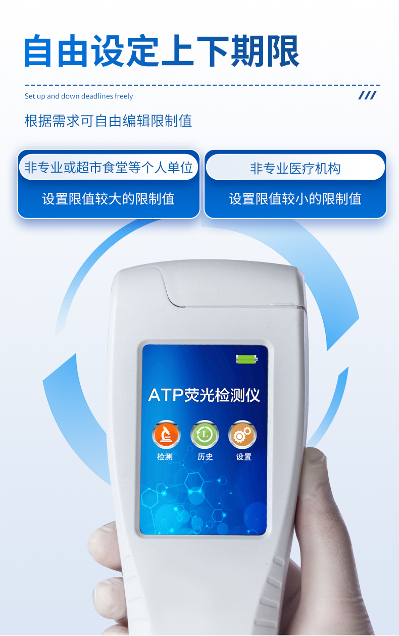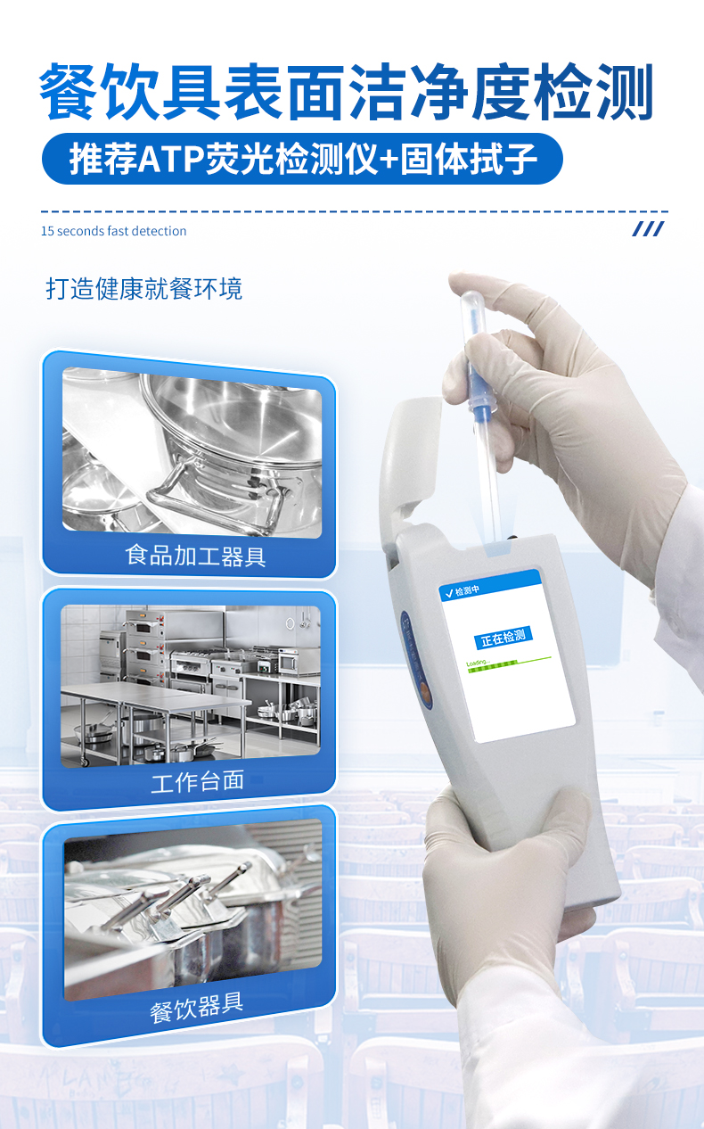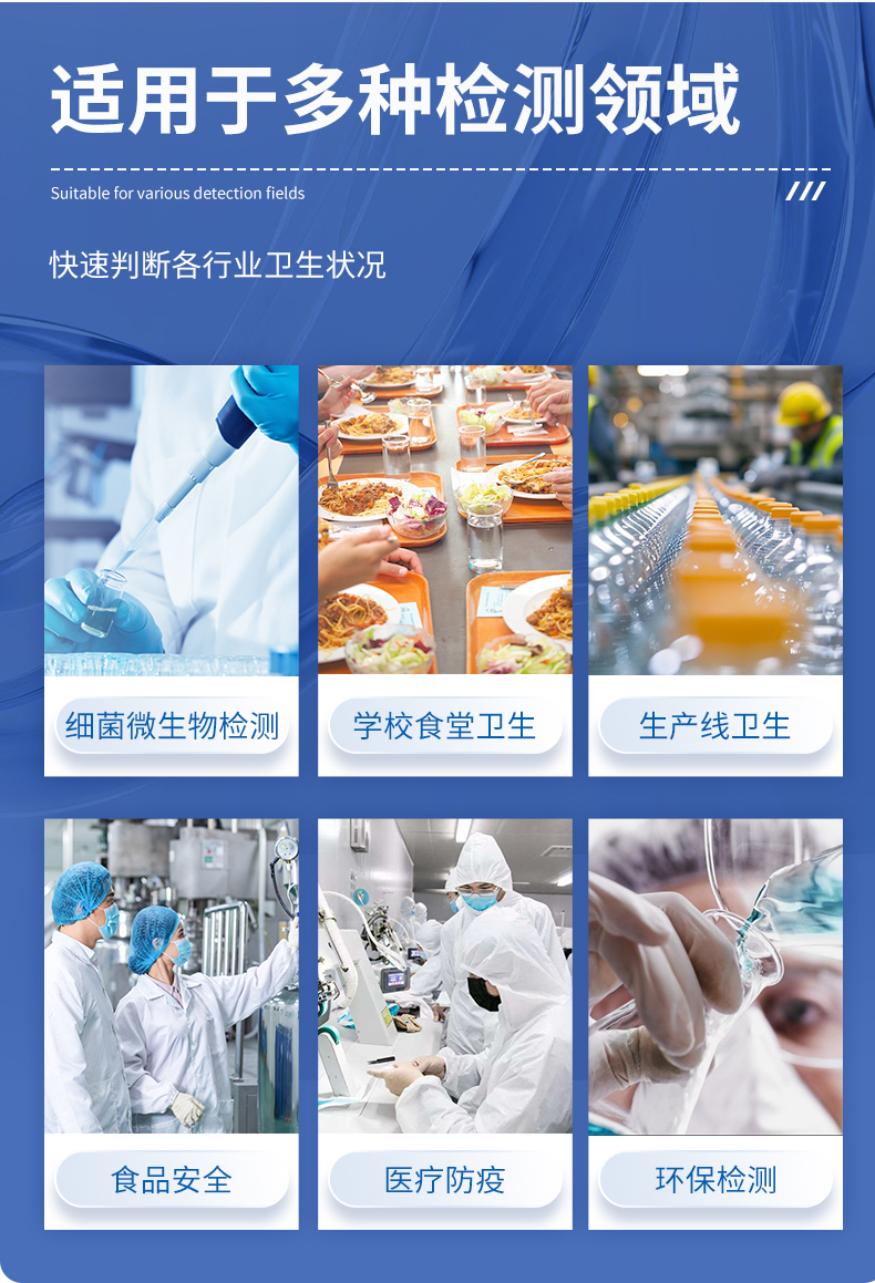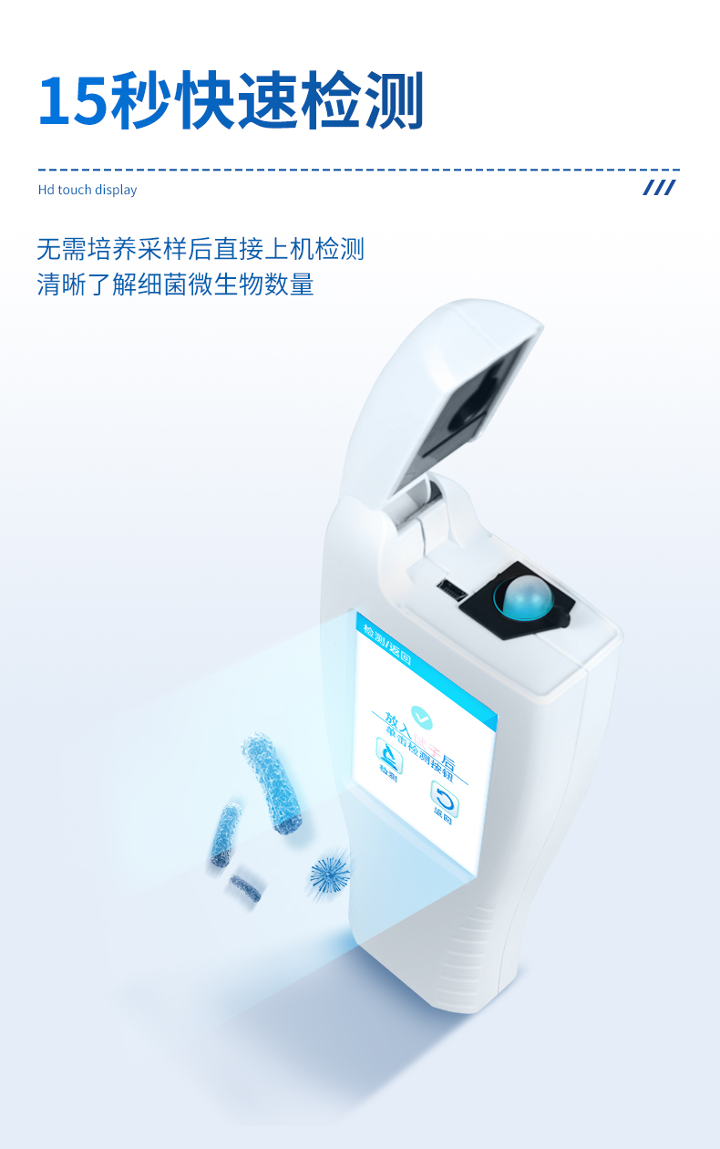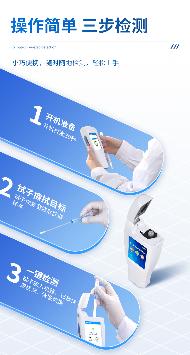 | 實(shí)用性 —— 可根據(jù)環(huán)境檢測(cè)需求設(shè)定上下限值,做到數(shù)據(jù)快速評(píng)估預(yù)警,表面潔凈度快速篩查。 | 靈敏度高 —— *************** | 速度快 —— 常規(guī)培養(yǎng)法18-24h以上,而ATP只需要十幾秒鐘 . | 可行性 —— 微生物數(shù)量與微生物體內(nèi)所含ATP有明確的相關(guān)性。 通過檢測(cè)ATP含量,可間接得出反應(yīng)中微生物數(shù)量 | 可操作性 —— 傳統(tǒng)培養(yǎng)方法需要在實(shí)驗(yàn)室由經(jīng)過培訓(xùn)的技術(shù)人員進(jìn)行操作;而ATP快速潔凈度檢測(cè)操作非常簡(jiǎn)便,只需簡(jiǎn)單的培訓(xùn)即可由一般工作人員進(jìn)行現(xiàn)場(chǎng)操作。 | 體驗(yàn)更好 —— 試子套管采用插拔式靈活設(shè)計(jì),可定期清洗長(zhǎng)期使用,延長(zhǎng)儀器壽命。 |