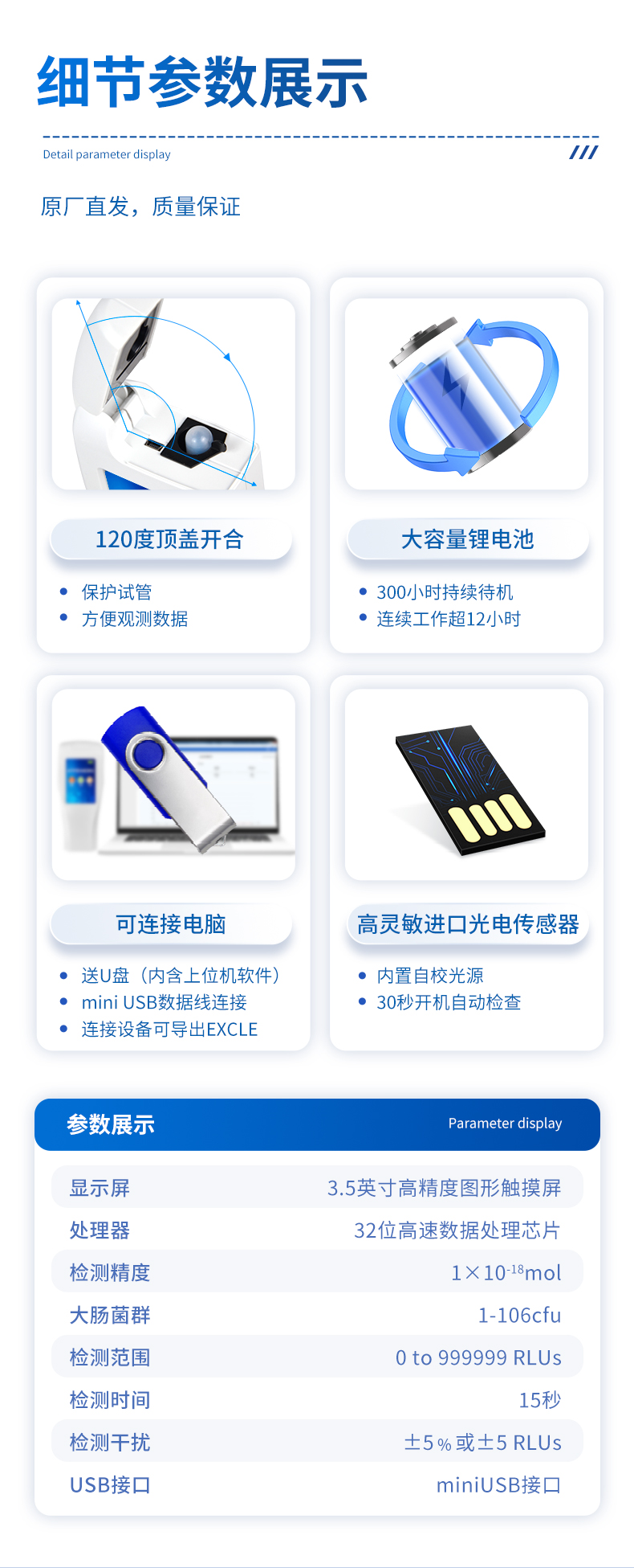 | 顯示屏:3.5英寸高精度圖形觸摸屏 | 處理器:32位高速數(shù)據(jù)處理芯片 | 檢測(cè)精度:********** | 大腸菌群:******** | 檢測(cè)范圍:**************** | 檢測(cè)時(shí)間:15秒 | 檢測(cè)干擾:±5﹪或±5 RLUs | 操作溫度范圍:5℃到40℃ | 操作濕度范圍:20—85﹪ | ATP回收率:90-110% | 檢出模式:RLU、大腸菌群篩查 | 50個(gè)用戶ID 設(shè)定 | 可任意設(shè)定上限值,下限值 | 自動(dòng)判斷合格與不合格 | 內(nèi)置自校光源 | 開機(jī)30秒自檢 | 配有miniUSB接口,可將結(jié)果上傳至PC | 配備專用軟件驅(qū)動(dòng)U盤代替?zhèn)鹘y(tǒng)光盤 | 儀器尺寸(W×H×D):188 mm×77mm×37mm | 使用可充電鋰電池免電池更換 | 備用狀態(tài)(20℃):6個(gè)月 | 中文操作手冊(cè) | 穩(wěn)定的液體熒光素酶 | 潤(rùn)濕的一體化采集拭子 | 儀器+標(biāo)配拭子包裝尺寸:330*280*220mm,包裝重量:2.3kg |