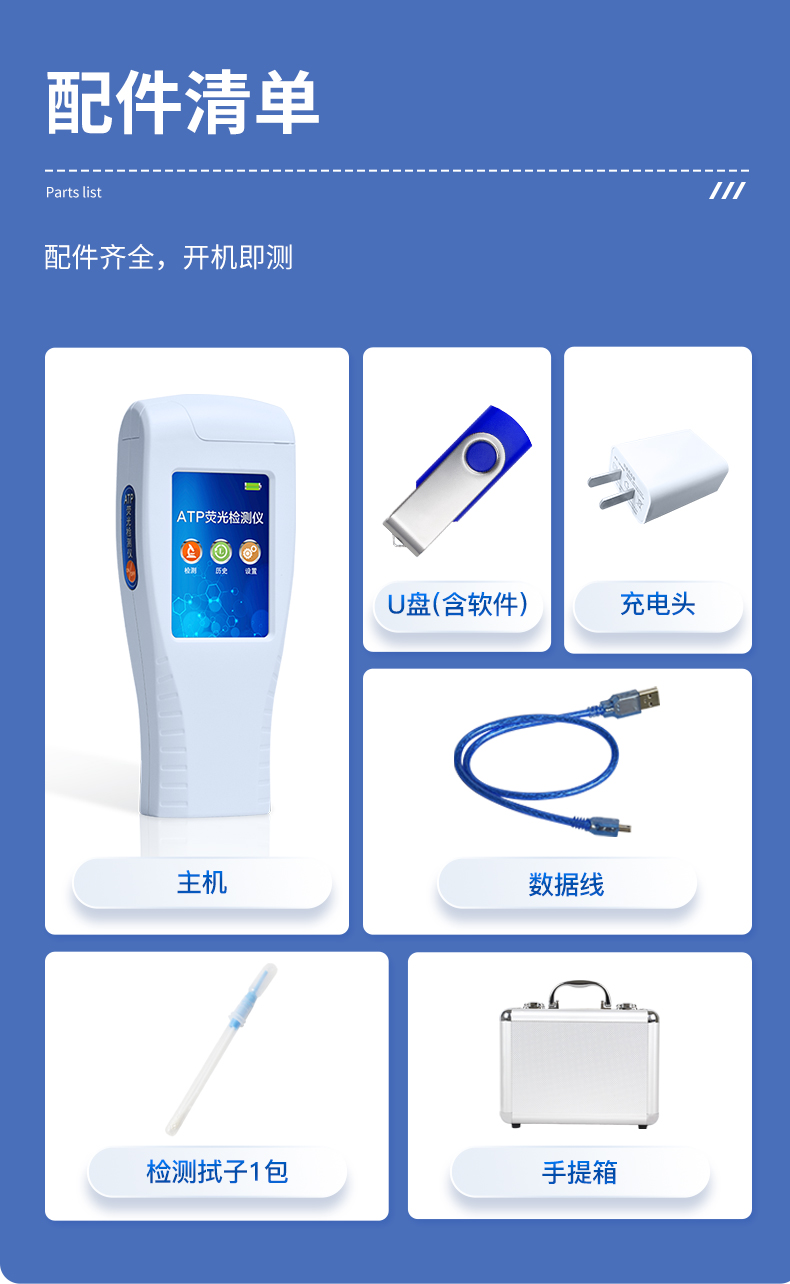 ATP熒光檢測(cè)儀用途廣泛,可用于: 食品、醫(yī)藥衛(wèi)生、醫(yī)藥、日化、造紙、工業(yè)水處理、國(guó)防以及環(huán)保、水政、海關(guān)出入境檢疫及其他執(zhí)法部門等多種行業(yè) 。 隨機(jī)配置:ATP熒光檢測(cè)儀(手持)主機(jī)、鋁合金手提箱、驅(qū)動(dòng)U盤、儀器包、掛繩、PC數(shù)據(jù)線、數(shù)據(jù)分析軟件、中文操作手冊(cè)