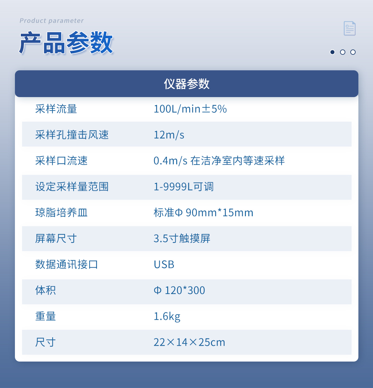 | 采樣流量:100L/min±5% | 采樣孔撞擊風速:12m/s | 采樣口流速:0.4m/s 在潔凈室內等速采樣 | 設定采樣量范圍:1-9999L可調 | 瓊脂培養(yǎng)皿:標準? 90mm*15mm | 屏幕尺寸:3.5寸觸摸屏 | 數據通訊接口:USB | 體積:Φ 120*300 | 重量:1.6kg | 尺寸:22×14×25cm |