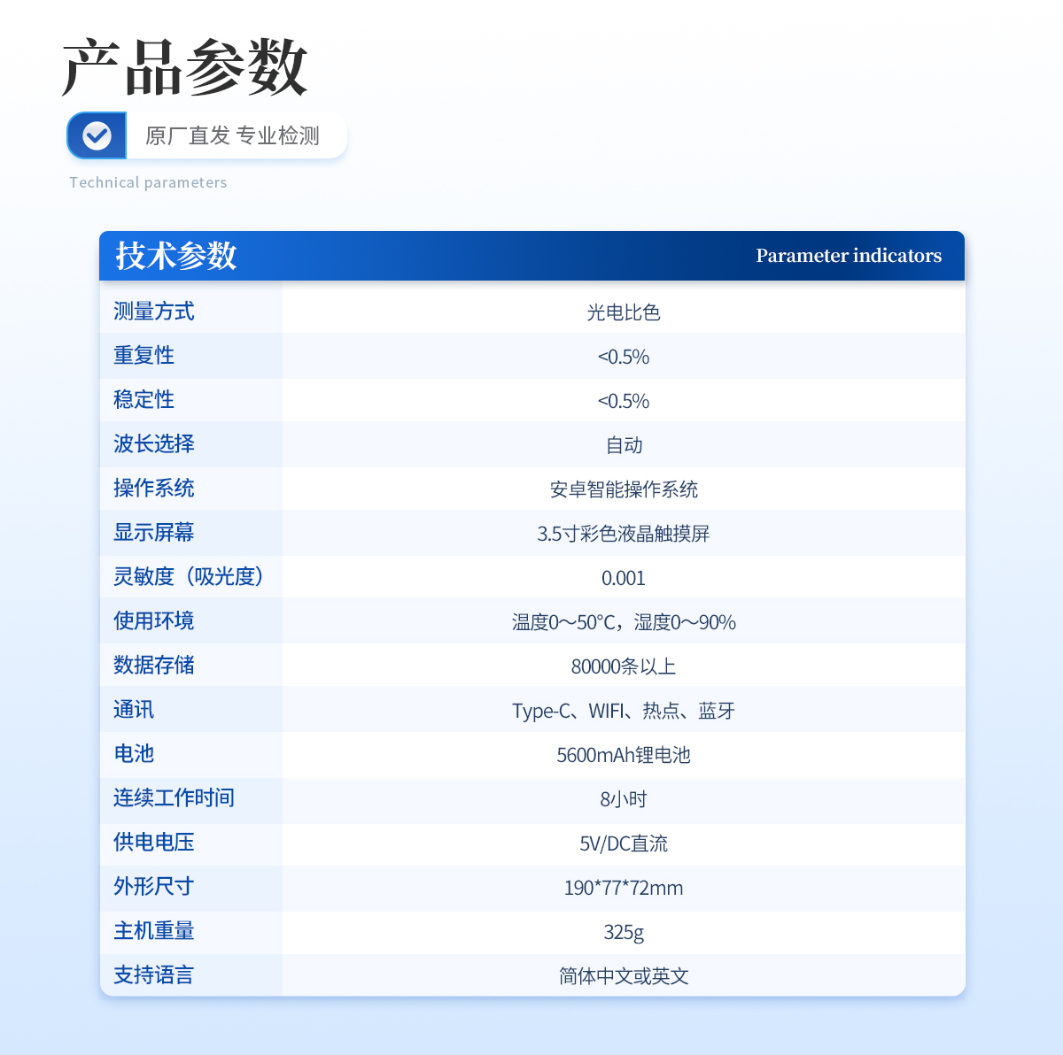 | 亞氯酸鹽:0.05~2.5mg/L; | 參考方法:碘量法原理 | 測量方式:光電比色 | 重復性:<0.5%> | 穩定性:<0.5%> | 波長選擇:自動 | 操作系統:安卓智能操作系統 | 顯示屏幕:3.5寸彩色液晶觸摸屏 | 靈敏度(吸光度):0.001 | 使用環境:溫度0~50℃,濕度0~90% | 數據存儲:80000條以上 | 通訊:Type-C、WIFI、熱點、藍牙 | 電池:5600mAh鋰電池 | 連續工作時間:8小時 | 供電電壓:5V/DC直流 | 尺寸:190mm*77mm*72mm | 主機重量:325g | 支持語言:簡體中文或英文 |