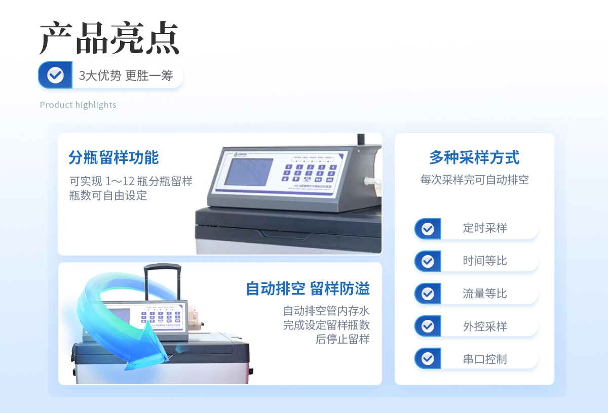| 1.定時采樣:按照采樣定時表設定,水質自動采樣器將定量水樣從采樣點采 集到留樣瓶中。 | 2.時間等比例采樣:按照設定采樣時間間隔,水質自動采樣器將定量水樣從 采樣點采集到到留樣瓶中。 | 3.流量等比例采樣:每流過一定體積的水體,水質自動采樣器自動將定量水樣從采樣點采集到留樣瓶中。 | 4.超標留樣(外控采樣):當接收到外部觸發信號一開關量信號時或模擬量信號,水質自動采樣器將定量水樣從采樣點采集到留樣瓶中。 | 5.串口控制:當接收到串口命令時,按命令要求進行采樣。 |