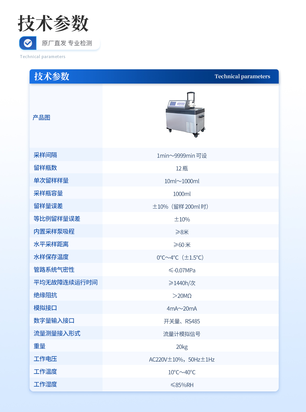 | 采樣間隔:1min~9999min 可設 | 留樣瓶數:12 瓶 | 單次留樣樣量:10ml~1000ml | 采樣瓶容量:1000ml | 留樣量誤差:±10%(留樣 200ml 時) | 等比例留樣量誤差:±10% | 內置采樣泵吸程:≥8米 | 水平采樣距離:≥60 米 | 水樣保存溫度:0℃~4℃(±1.5℃) | 管路系統氣密性:≤-0.07MPa | 平均無故障連續運行時間:≥1440h/次 | 絕緣阻抗:>20MΩ | 模擬接口:4mA~20mA | 數字量輸入接口:開關量、RS485 | 流量測量接入形式:流量計模擬信號 | 重量:20kg | 工作電壓:AC220V±10%,50Hz±1Hz | 工作溫度:10℃~40℃ | 工作濕度:≤85%RH |