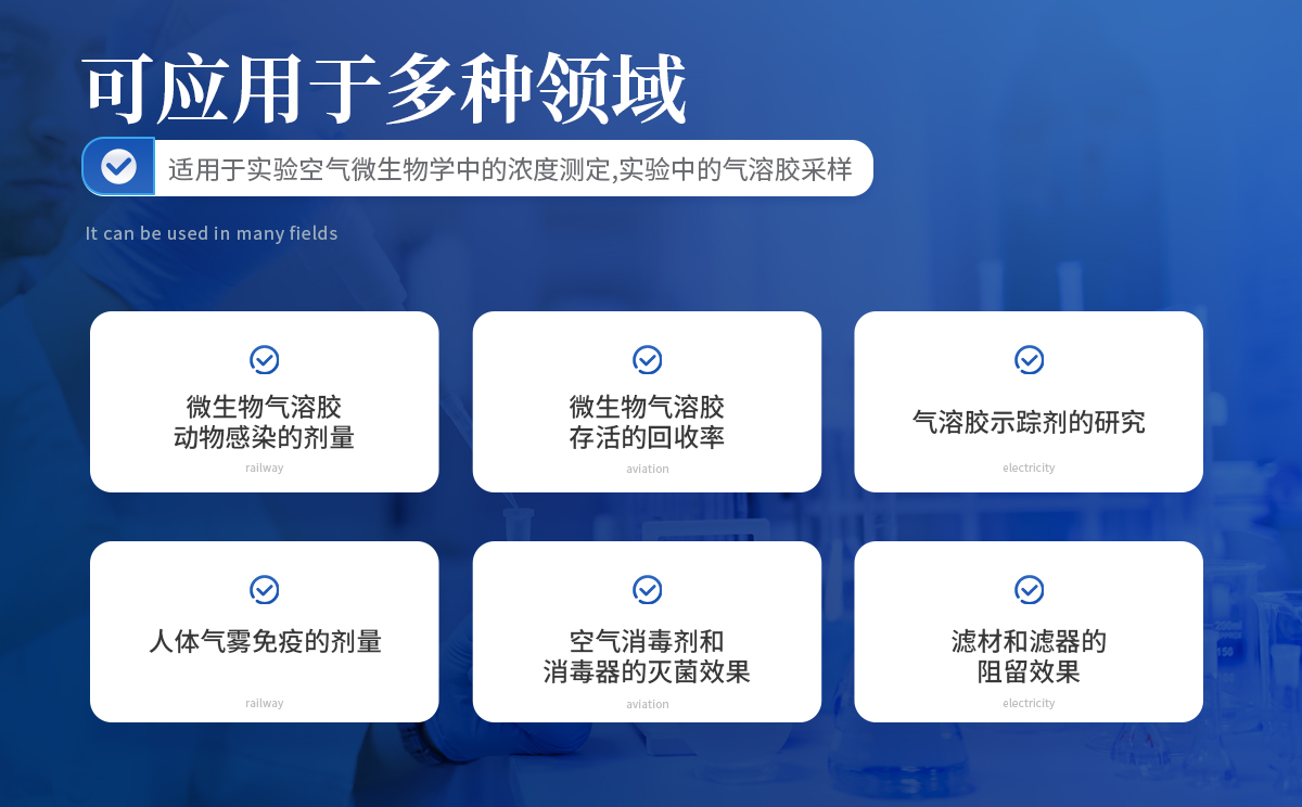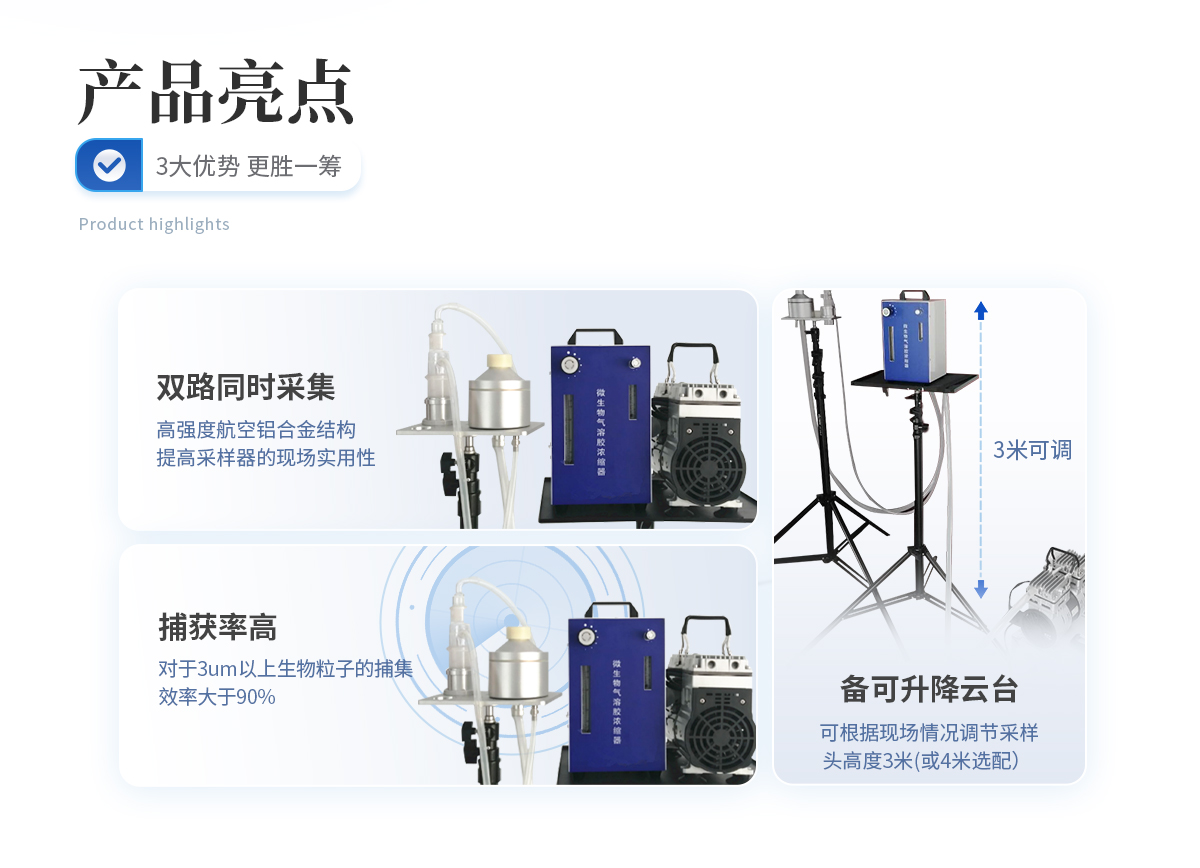 | **率玻璃沖擊瓶捕集裝置的特殊設計,它需要一臺高流量音速的空氣采樣幫浦, 用來捕集空氣中微生物(如細菌、真菌、花粉、病毒)與其副產物如內毒素、霉菌毒素及其他碎片,以供進一步分析。 | 液體沖擊式微生物氣溶膠采樣器有三個切線式彎度的噴嘴頭,具決定性的或音速(sonic flow)的小孔,每孔允許4.2公升/分鐘的空氣通過共同組成的流量,達到約12.5公升/分鐘的流速。容許有效捕集總生物氣膠或活生物氣膠有效時間達8小時以上 。 |