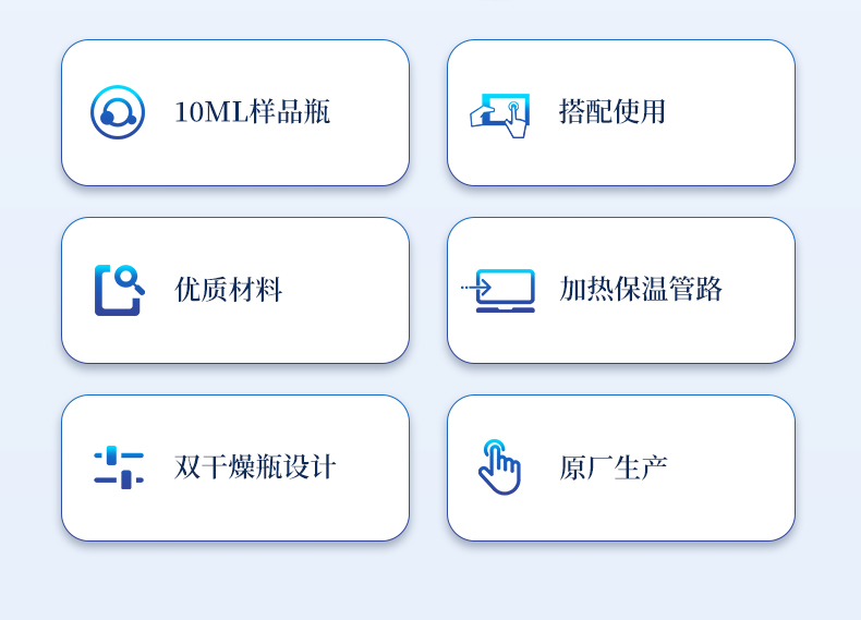 | 1、10ml樣品瓶:使用四氟與硅膠復(fù)合墊片,高溫條件下不會釋放可能產(chǎn)生副反應(yīng)的物質(zhì) | 2、雙干燥瓶設(shè)計,有效降低氣源中的水分干擾 | 3、加熱保溫管路,防止水汽在輸送過程中冷凝,提高測試準確性 |