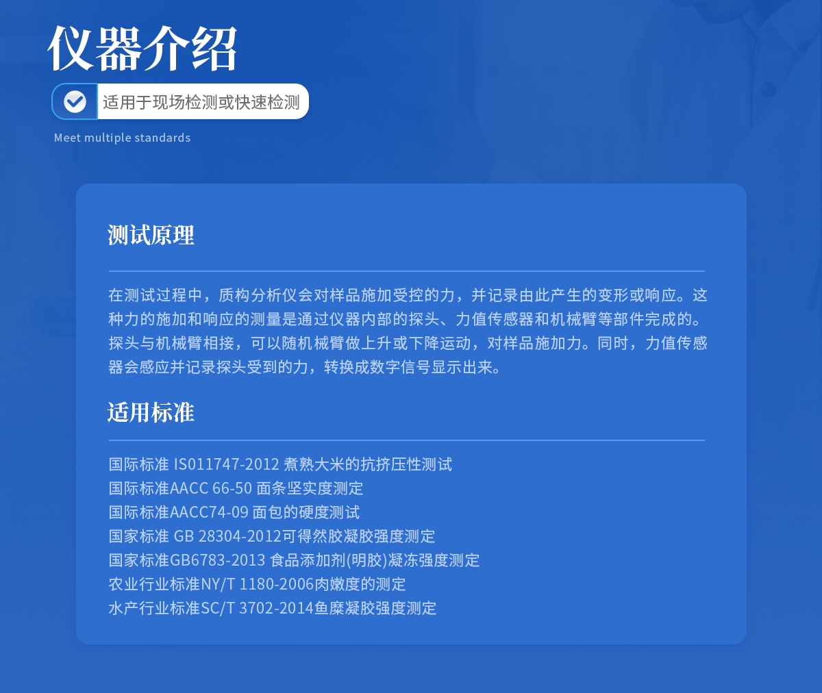 | 國際標準 IS011747-2012 煮熟大米的抗擠壓性測試 | 國際標準AACC 66-50 面條堅實度測定 | 國際標準AACC74-09 面包的硬度測試 | 國家標準 GB 28304-2012可得然膠凝膠強度測定 | 國家標準GB6783-2013 食品添加劑(明膠)凝凍強度測定 | 農業行業標準NY/T 1180-2006肉嫩度的測定 | 水產行業標準SC/T 3702-2014魚糜凝膠強度測定 |