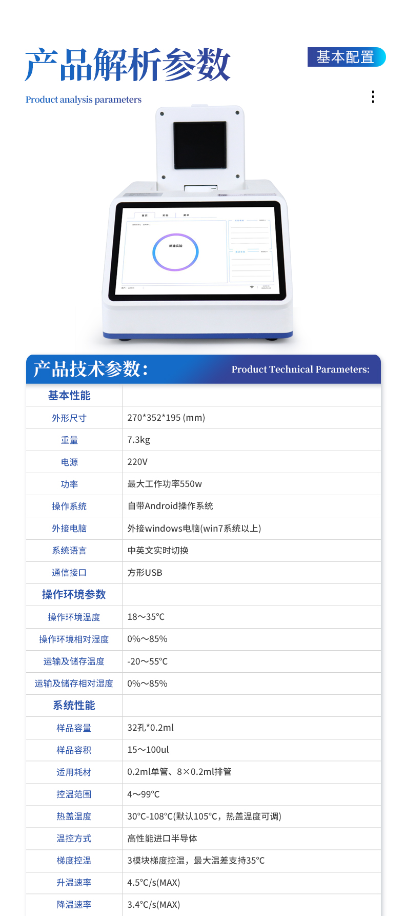 | 1.智能操作系統(tǒng),實驗盡在掌握 | A雙模式靈活控制:支持通過儀器觸摸屏獨立運行,也支持通過電腦軟件進行遠程控制與數(shù)據(jù)管理,適應(yīng)不同實驗場景需求。 | B程序更新與預設(shè):支持在線更新實驗程序,并內(nèi)置豐富的預設(shè)實驗程序模板,用戶亦可自定義保存常用模版,實現(xiàn)一鍵快速啟動,極大提升操作效率。 | C極簡啟動體驗(可選配):可定制集成攝像頭掃描系統(tǒng),用戶只需掃描樣品板或程序卡的二維碼,即可自動識別并調(diào)用對應(yīng)實驗程序,簡化流程,避免人為設(shè)置錯誤。 | D操作簡單:無論是觸摸屏界面還是電腦軟件,均設(shè)計得直觀易懂,新用戶也能快速上手。預置常用程序模板,進一步簡化操作流程。 | 2.精準穩(wěn)定的溫控與光學核心 | A長久精準的溫控系統(tǒng):采用進口***TEC半導體制冷模塊,控溫精準(±0.1°C),孔間溫度均勻性**(≤±0.3°C)。系統(tǒng)穩(wěn)定性卓越,長期使用性能衰減小,校準周期長達數(shù)年,顯著降低維護成本與運營中斷。 | B免維護的靈敏光學系統(tǒng):配備4個獨立LED光源與4個獨立光電二極管檢測器,實現(xiàn)四通道熒光同步精準檢測。采用超長壽命進口光源,設(shè)計壽命期內(nèi)免維護,無需額外校準或更換,保障檢測結(jié)果長期一致性與高靈敏度。 | C卓越的數(shù)據(jù)質(zhì)量:實驗線性相關(guān)性高(R2≥0.999),重復性優(yōu)異(孔間CV值低),確保定量結(jié)果準確可靠,數(shù)據(jù)置信度高 | 3.**便捷的數(shù)據(jù)與輸出管理 | A多重數(shù)據(jù)導出方式:支持通過USB存儲設(shè)備直接拷貝,或經(jīng)由Wi-Fi無線網(wǎng)絡(luò)傳輸數(shù)據(jù)至本地服務(wù)器或云端,方便靈活,滿足各類實驗室數(shù)據(jù)管理習慣。 | B豐富的報告導出與打印:支持生成并導出多種格式(如PDF、Excel)的實驗報告。儀器兼容USB熱敏打印機、藍牙無線打印機及常規(guī)A4打印機,可直接在儀器上或通過電腦一鍵導出并打印專業(yè)報告,便于結(jié)果存檔與即時分享。 | 4.快速**與堅固耐用 | A升降溫速度快:優(yōu)化設(shè)計的溫控系統(tǒng)具備高速升降溫能力,顯著縮短單次循環(huán)與整體檢測時間,提升實驗通量。 | B超長使用壽命:核心部件均選用工業(yè)級耐用材料與設(shè)計,整機運行穩(wěn)定可靠,致力于為用戶提供長久的投資回報。 |