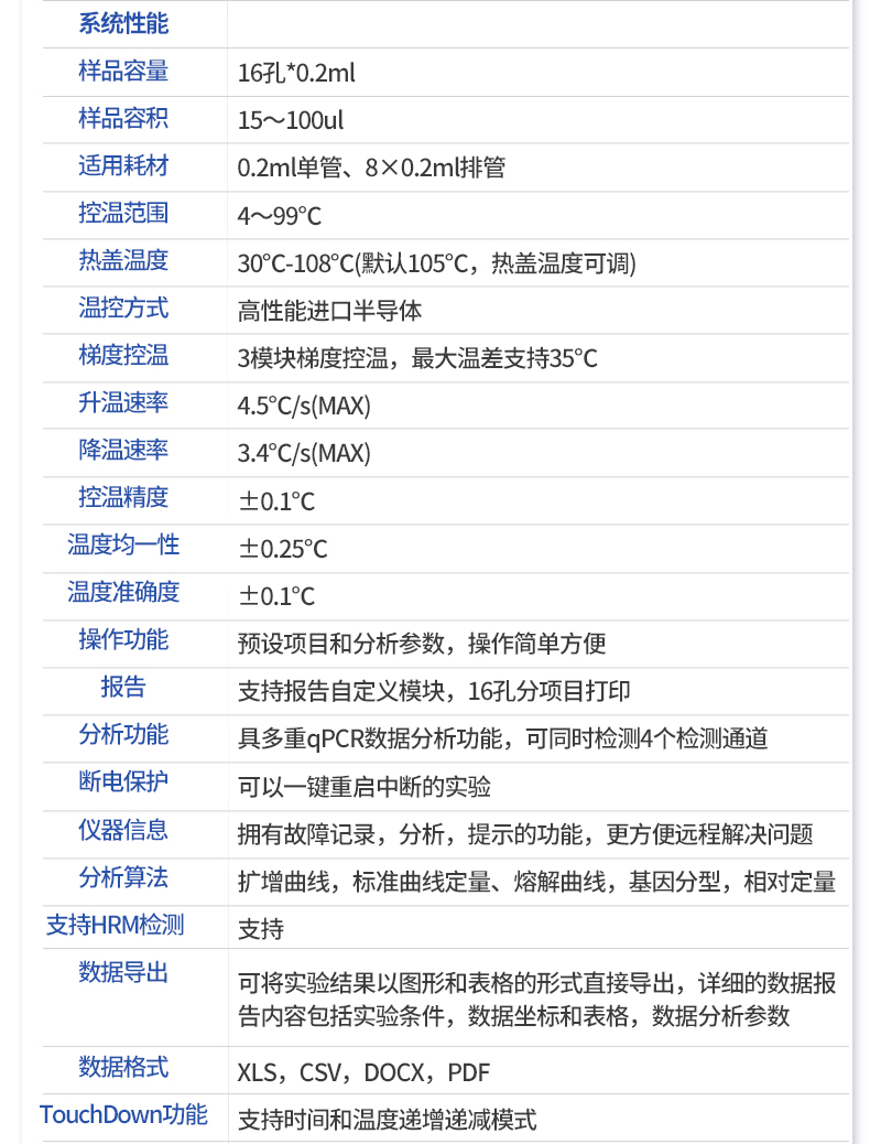 | 基本性能 | 外形尺寸:270*352*195 (mm) | 重量:7.1kg | 電源:220V | 功率:**工作功率300w | 操作系統(tǒng):自帶Android操作系統(tǒng) | 外接電腦:外接windows電腦(win7系統(tǒng)以上) | 系統(tǒng)語言:中英文實(shí)時(shí)切換 | 通信接口:方形USB | 操作環(huán)境參數(shù) | 操作環(huán)境溫度:18~35℃ | 操作環(huán)境相對濕度:0%~85% | 運(yùn)輸及儲存溫度:-20~55℃ | 運(yùn)輸及儲存相對濕度:0%~85% | 系統(tǒng)性能 | 樣品容量:16孔*0.2ml | 樣品容積:15~100ul | 適用耗材:0.2ml單管、8×0.2ml排管 | 控溫范圍:4~99℃ | 熱蓋溫度:30℃-108℃(默認(rèn)105℃,熱蓋溫度可調(diào)) | 溫控方式:高性能進(jìn)口半導(dǎo)體 | 梯度控溫:3模塊梯度控溫,**溫差支持35℃ | 升溫速率:4.5℃/s(MAX) | 降溫速率:3.4℃/s(MAX) | 控溫精度:±0.1℃ | 溫度均一性:±0.25℃ | 溫度準(zhǔn)確度:±0.1℃ | 操作功能:預(yù)設(shè)項(xiàng)目和分析參數(shù),操作簡單方便 | 報(bào)告:支持報(bào)告自定義模塊,16孔分項(xiàng)目打印 | 分析功能:具多重qPCR數(shù)據(jù)分析功能,可同時(shí)檢測4個(gè)檢測通道 | 斷電保護(hù):可以一鍵重啟中斷的實(shí)驗(yàn) | 儀器信息:擁有故障記錄,分析,提示的功能,更方便遠(yuǎn)程解決問題 | 分析算法:擴(kuò)增曲線,標(biāo)準(zhǔn)曲線定量、熔解曲線,基因分型(SNP),相對定量 | 支持HRM檢測:支持 | 數(shù)據(jù)導(dǎo)出:可將實(shí)驗(yàn)結(jié)果以圖形和表格的形式直接導(dǎo)出;詳細(xì)的數(shù)據(jù)報(bào)告內(nèi)容包括實(shí)驗(yàn)條件,數(shù)據(jù)坐標(biāo)和表格,數(shù)據(jù)分析參數(shù)。 | 數(shù)據(jù)格式:XLS, CSV, DOCX,PDF | TouchDown功能:支持時(shí)間和溫度遞增遞減模式 | 熒光檢測系統(tǒng)性能 | 檢測靈敏度:可檢測單拷貝基因 | 動(dòng)態(tài)范圍:1~10^10 | 熒光重復(fù)性:CV<1%(使用某品牌試劑做16孔均一性實(shí)驗(yàn),16個(gè)孔的Ct差值保持在0.5以內(nèi),CV保持在1%以內(nèi)。) | 相關(guān)系數(shù):0.99~1(每種濃度3個(gè)重復(fù),梯度曲線的相關(guān)系數(shù)>0.99,擴(kuò)增效率保持在99%~101%之間) | 擴(kuò)增效率:99%~101% | 可信度:區(qū)分1000與2000拷貝濃度差異 | 激光光源:大功率LED(免維護(hù),壽命長) | 檢測器:高靈敏度光電傳感器 | 激發(fā)和檢測傳播介質(zhì):耐高溫專業(yè)導(dǎo)光光纖 | 激發(fā)光波長:460nm~480nm , 525nm~545nm, 575nm~595nm ,600nm~620nm | 檢測光波長:505nm~525nm , 555nm~575nm , 600nm~620nm , 660nm~680nm |