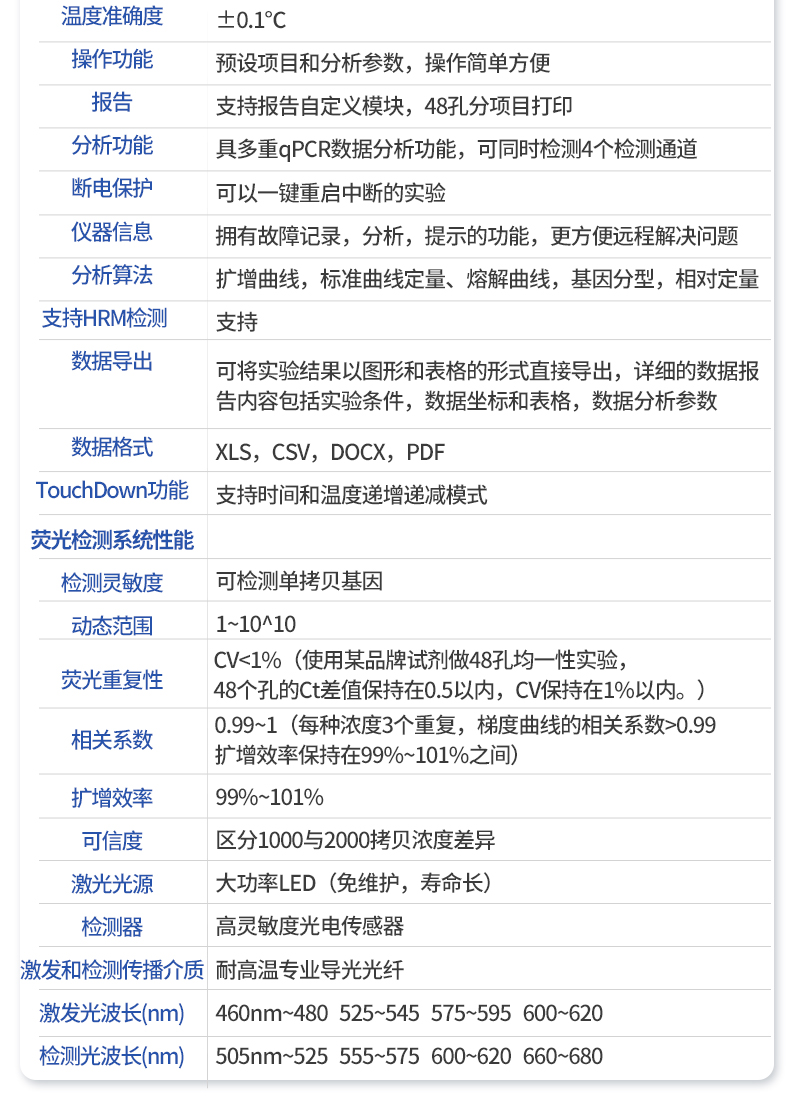 | 基本性能 | 外形尺寸:270*352*195 (mm) | 重量:7.5kg | 電源:220V | 功率:**工作功率550w | 操作系統(tǒng):自帶Android操作系統(tǒng) | 外接電腦:外接windows電腦(win7系統(tǒng)以上) | 系統(tǒng)語言:中英文實(shí)時(shí)切換 | 通信接口:方形USB | 操作環(huán)境參數(shù) | 操作環(huán)境溫度:18~35℃ | 操作環(huán)境相對(duì)濕度:0%~85% | 運(yùn)輸及儲(chǔ)存溫度:-20~55℃ | 運(yùn)輸及儲(chǔ)存相對(duì)濕度:0%~85% | 系統(tǒng)性能 | 樣品容量:48孔*0.2ml | 樣品容積:15~100ul | 適用耗材:0.2ml單管、8×0.2ml排管 | 控溫范圍:4~99℃ | 熱蓋溫度:30℃-108℃(默認(rèn)105℃,熱蓋溫度可調(diào)) | 溫控方式:高性能進(jìn)口半導(dǎo)體 | 梯度控溫:3模塊梯度控溫,**溫差支持35℃ | 升溫速率:4.5℃/s(MAX) | 降溫速率:3.4℃/s(MAX) | 控溫精度:±0.1℃ | 溫度均一性:±0.25℃ | 溫度準(zhǔn)確度:±0.1℃ | 操作功能:預(yù)設(shè)項(xiàng)目和分析參數(shù),操作簡單方便 | 報(bào)告:支持報(bào)告自定義模塊,48孔分項(xiàng)目打印 | 分析功能:具多重qPCR數(shù)據(jù)分析功能,可同時(shí)檢測(cè)4個(gè)檢測(cè)通道 | 斷電保護(hù):可以一鍵重啟中斷的實(shí)驗(yàn) | 儀器信息:擁有故障記錄,分析,提示的功能,更方便遠(yuǎn)程解決問題 | 分析算法:擴(kuò)增曲線,標(biāo)準(zhǔn)曲線定量、熔解曲線,基因分型(SNP),相對(duì)定量 | 支持HRM檢測(cè):支持 | 數(shù)據(jù)導(dǎo)出:可將實(shí)驗(yàn)結(jié)果以圖形和表格的形式直接導(dǎo)出;詳細(xì)的數(shù)據(jù)報(bào)告內(nèi)容包括實(shí)驗(yàn)條件,數(shù)據(jù)坐標(biāo)和表格,數(shù)據(jù)分析參數(shù)。 | 數(shù)據(jù)格式:XLS, CSV, DOCX,PDF | TouchDown功能:支持時(shí)間和溫度遞增遞減模式 | 熒光檢測(cè)系統(tǒng)性能 | 檢測(cè)靈敏度:可檢測(cè)單拷貝基因 | 動(dòng)態(tài)范圍:1~10^10 | 熒光重復(fù)性:CV<1%(使用某品牌試劑做48孔均一性實(shí)驗(yàn),48個(gè)孔的Ct差值保持在0.5以內(nèi),CV保持在1%以內(nèi)。) | 相關(guān)系數(shù):0.99~1(每種濃度3個(gè)重復(fù),梯度曲線的相關(guān)系數(shù)>0.99,擴(kuò)增效率保持在99%~101%之間) | 擴(kuò)增效率:99%~101% | 可信度:區(qū)分1000與2000拷貝濃度差異 | 激光光源:大功率LED(免維護(hù),壽命長) | 檢測(cè)器:高靈敏度光電傳感器 | 激發(fā)和檢測(cè)傳播介質(zhì):耐高溫專業(yè)導(dǎo)光光纖 | 激發(fā)光波長:460nm~480nm , 525nm~545nm, 575nm~595nm ,600nm~620nm | 檢測(cè)光波長:505nm~525nm , 555nm~575nm , 600nm~620nm , 660nm~680nm |