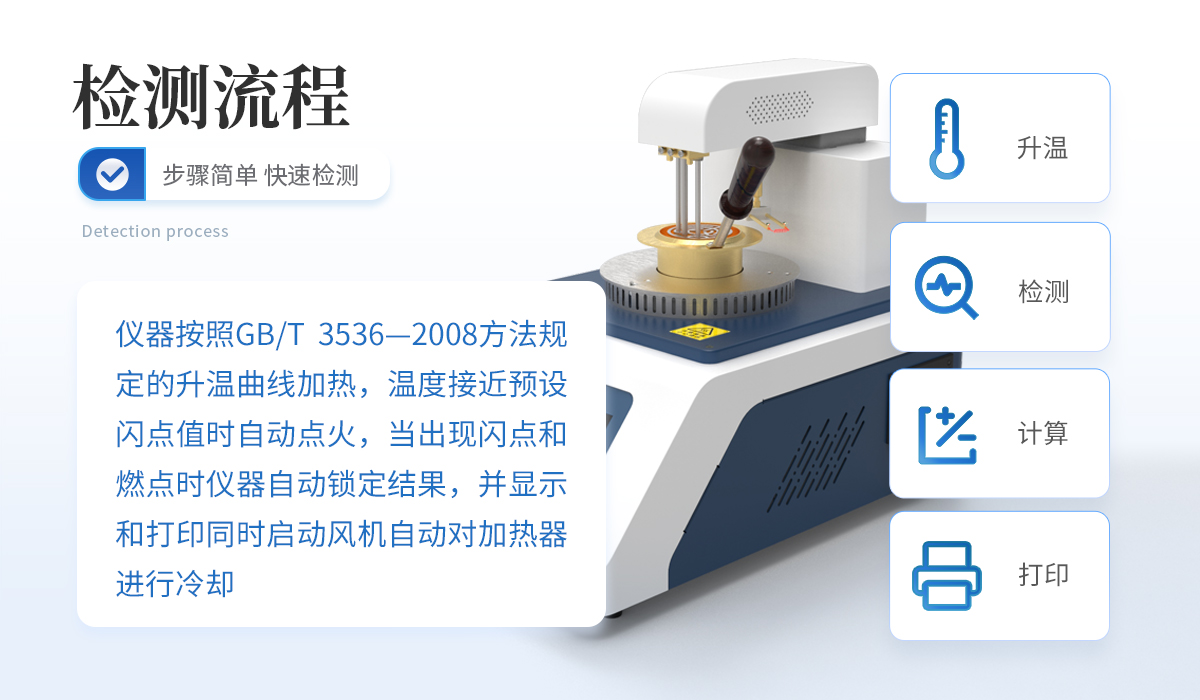 儀器按照GB/T 261-2021方法規定的升溫曲線加熱,溫度接近預期閃點值時自動點火,當出現閃點時儀器自動鎖定結果,并顯示和打印,同時啟動風機自動對加熱器進行冷卻。