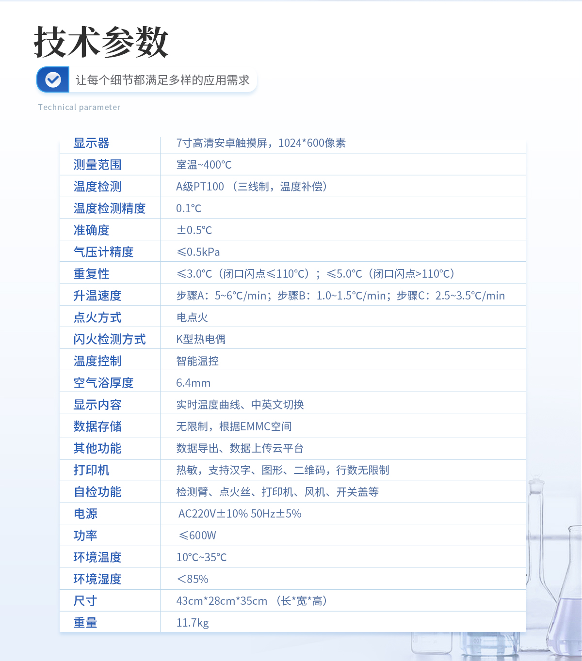 | 顯示器 7寸高清安卓觸摸屏,1024*600像素 | 測量范圍 室溫~400℃ | 溫度檢測 A級PT100 (三線制,溫度補償) | 溫度檢測精度 0.1℃ | 準確度 ±0.5℃ | 氣壓計精度 ≤0.5kPa | 重復性 ≤3.0℃(閉口閃點≤110℃);≤5.0℃(閉口閃點>110℃) | 升溫速度 步驟A:5~6℃/min;步驟B:1.0~1.5℃/min;步驟C:2.5~3.5℃/min | 點火方式 電點火 | 閃火檢測方式 K型熱電偶 | 溫度控制 智能溫控 | 空氣浴厚度 6.4mm | 顯示內容 實時溫度曲線、中英文切換 | 數據存儲 無限制,根據EMMC空間 | 其他功能 數據導出、數據上傳云平臺 | 打印機 熱敏,支持漢字、圖形、二維碼,行數無限制 | 自檢功能 檢測臂、點火絲、打印機、風機、開關蓋等 | 電源 AC220V±10% 50Hz±5% | 功率 ≤600W | 環境溫度 10℃~35℃ | 環境濕度 <85% | 尺寸 43cm*28cm*35cm (長*寬*高) | 重量 11.7kg |