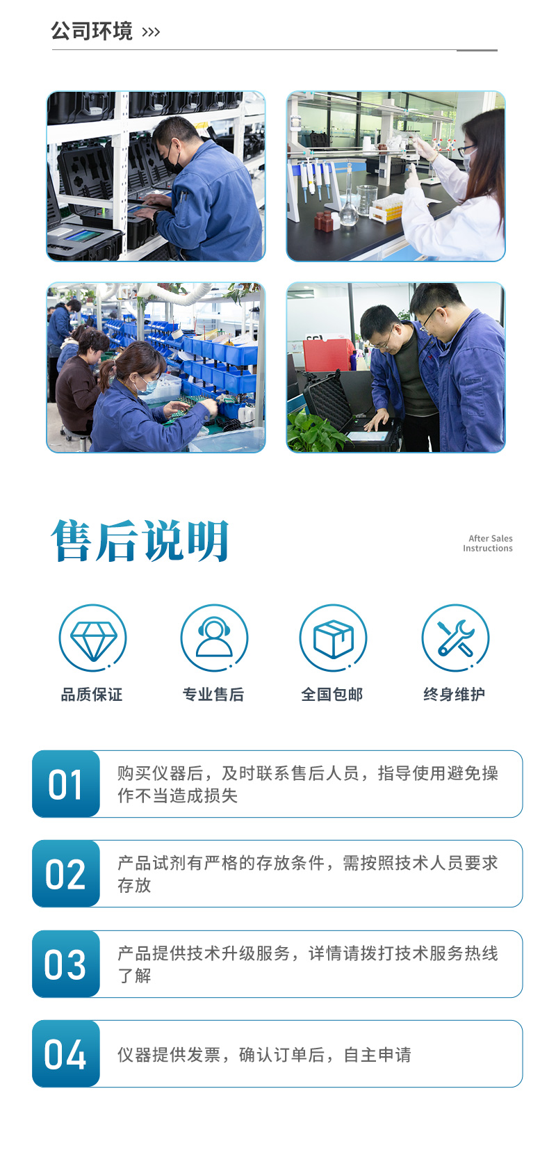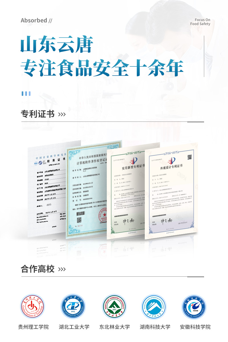 | 1、儀器采用手提箱一體化設計,將分光光度模塊、膠體金檢測模塊、新型農殘檢測模塊、數字化管理模塊、無線通訊模塊高度集成于一體,同時預留升級檢測方法,可遠程進行升級系統。 | 2、儀器檢測模塊標準化、智能化,檢測項目可隨意自由組合。檢測箱體內置多個標準檢測單元,檢測模塊可以調整配置。 | 3、顯示屏幕:儀器采用10.1英寸豎向液晶觸摸屏顯,搭配運行安卓智能操作系統,主控芯片采用ARM Cortex-A7,RK3288/4核處理器,主頻1.88Ghz,操作方便,性能更強。 | 4、檢測通道:≥12通道;采用精密旋轉比色池設計,使用同芯片同光源校準精度,解決不同光源之間的誤差值,更加準確**。(1-12通道間誤差0.1%,***:**202022821055.2) | 5、儀器光源:高精度進口四波長冷光源,每個通道均配置 410、520、590、630nm 波長光源,標配**的光路切換裝置,專利光路切換功能可實現64波長,并且所有檢測項目可實現所有通道同時檢測。 | 6、設備可一鍵校準,自動保存校準數據,自動對比校驗,得到精準光源,采用Android SP存儲數據,光源數據永不丟失,方便每一次使用。 | 7、通訊接口:配備無線通信模塊、4G(APN)通訊模塊、藍牙傳輸,同時具有雙USB接口以及RJ45網線接口,可以多方式實現數據保存及數據傳輸。 | 8、存儲方式:支持U盤存儲,標準USB接口,免驅動安裝。檢測結果存儲容量20萬條以上,可生成Excel表格進行拷貝,并具有登錄保護功能。 | 9、智能化操作系統: | 9.1、操作系統:儀器可在同一檢測界面自動對應相關檢測通道,一次性選擇1-12個樣品名稱,無需退出界面,節省操作時間。并可以對每個通道屬性和樣品信息單獨進行編輯,例如送檢單位、人員,檢測人員等,打印時勾選打印顯示。 | 9.2、數據集成系統:設備首頁自動匯總分析檢測數據,包含:周檢測數據、月檢測數據,全部檢測總數量,包含檢測總數,合格數,不合格數,以及相關柱形分析圖,各項檢測數據一目了然,無需電腦查詢,更加快捷直觀。 | 9.3、數據庫系統:十幾項數據庫分類管理儀器:包含項目類型、項目數據、檢測數據、歷史記錄、國標信息、曲線信息、采樣信息、檢測信息、受檢信息、復核信息、圖表信息、光源校準信息、打印樣式信息、樣品庫信息等等,數據庫之間互相協調聯動保證數據的真實完整性。同時產品數據庫以及歷史檢測記錄支持一鍵檢索功能。 | 9.4、限量規判系統:具有限量查詢、添加物質合規判定系統。檢測出結果后,系統自動調用系統數據庫中相關國標進行比對判定,客觀顯示判定結果是否合格。 | 9.5、項目預設系統:儀器具有任務預設模塊,一鍵提前預設,給出方便快捷的新檢測方案,每一個任務分別可以設置不同的樣品、批次、編號、來源、備注、抽樣信息、檢測信息、受檢信息、復核信息等更多信息。樣品送檢時一鍵調取保存信息,并可多次調取,大大提高檢測效率。 | 9.6、數據監管系統:同步對接監管平臺,數據可局域網和互聯網數據上傳,檢測結果可直接傳至食品安全監管平臺。進行區域食品安全監管及大數據分析處理與數據統計,監測區域食品安全長短期動態及問題預估、預警。 | 9.7.1、全新打印系統:內置全新打印機,新創自定義打印方式,可按需靈活勾選控制:產品合格證(國家農業部標準要求),二維碼,抽樣信息、檢測信息,受檢信息、復核信息、抽樣日期、檢測日期等信息的打印。 | 9.7.2、A4紙版本報告打印功能(可選配):設備擁有兩種結果展示方式,可以自動生成A4打印模板和小票打印模板兩種樣式,可通過WiFi及網線等方式鏈接外置打印機可進行打印。 | 10、供電模式:儀器交直流兩用,直流12V供電,可連接車載電源,配6ah大容量充電鋰電池,電量可實時顯示,方便戶外流動測試。 | 11、膠體金檢測模塊:采用CMOS成像處理技術及膠體金免疫層析技術,可讀取膠體金卡數據,自動采集、處理分析,將檢測結果顯示,并可根據參考限值自動判斷檢測結果,可檢測常見的獸藥殘留、生物毒素、抗生素、違禁添加物等。 | 11.1、探測技術:CMOS成像探測; | 11.2、檢測通道:1個通道; | 11.3、檢測方式:消線法和比色法; | 11.4、顯示模式:陰性或陽性; | 11.5、曲線形式:軌道式掃描方式,顯示金標卡圖像,實時生成、識別CT曲線圖,無需手動調整,完成檢測后自動退出檢測卡。兼容市場上其他金標卡,使用耗材不受限制。 | 12、儀器具備遠程升級功能,可定向分客戶分儀器更新,開機后自動更新,并可持續性免費更新系統版本,無需像傳統產品返廠更新,節省時間及人力成本并避免了物流運輸返廠升級導致設備損壞的潛在風險。 |