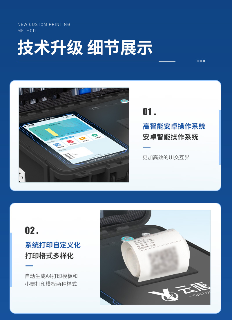 | 儀器采用10.1英寸液晶觸摸屏顯,搭配運行安卓智能操作系統(tǒng),主控芯片采用ARM Cortex-A7,RK3288/4核處理器,主頻1.88Ghz,運轉(zhuǎn)速度更快速,性能更強。 | 儀器功能包括:膠體金檢測模塊、數(shù)字化管理模塊、無線通訊模塊等,可以滿足同一軟件下實現(xiàn)所有檢測項目的檢測,并在同一窗口展示檢測結(jié)果。 | 一體化便攜式快檢設(shè)備,采用交直流兩用供電方式,可連接車載電源,配備6ah大容量充電鋰電池,可以滿足現(xiàn)場及流動檢測使用的需求。儀器尺寸:43×35×20cm, 主機凈重:5.1kg | 系統(tǒng)自帶數(shù)據(jù)集成模塊,設(shè)備首頁自動統(tǒng)計檢測數(shù)據(jù)包含:周檢測數(shù)據(jù)、月檢測數(shù)據(jù),全部檢測總數(shù)量,均包含檢測總數(shù),合格數(shù),不合格數(shù),以及相關(guān)柱形分析圖,對各項檢測數(shù)據(jù)清晰掌握,無需電腦查詢,更加快捷直觀。 | 儀器具有任務(wù)預(yù)設(shè)模塊,可在樣品送檢前提前預(yù)設(shè)樣品名稱、檢測指標(biāo)、送檢單位等信息,樣品送檢時一鍵調(diào)取保存信息,檢測更加方便快捷。 | 軌道式自動傳輸掃描方式,可實時顯示金標(biāo)卡實時圖像,系統(tǒng)自動分析并呈現(xiàn)出CT曲線圖,CT線自動識別,無需手動調(diào)整,完成檢測后自動退出檢測卡。 | 結(jié)果判定線可修改,對照值標(biāo)定值可保存,斷電不丟失數(shù)據(jù)。 | 兼容市場上其他膠體金卡,使用耗材不受限制,極大增強用戶使用體驗。 | 儀器檢測系統(tǒng)擁有龐大數(shù)據(jù)庫,并且構(gòu)建了完善的檢索、修訂功能。食品庫涵蓋多種樣品名稱,可按需添加或刪除、編輯樣品名稱;產(chǎn)品數(shù)據(jù)庫以及歷史檢測記錄支持一鍵檢索功能。 | 系統(tǒng)打印自定義化,打印格式多樣化,產(chǎn)品合格證(國家標(biāo)準(zhǔn)要求),二維碼,抽樣信息、檢測信息,受檢信息、復(fù)核信息、抽樣日期、檢測日期等信息結(jié)果,可按需求自行設(shè)置打印內(nèi)容。 | A4紙版本報告打印功能(可選配):設(shè)備擁有兩種結(jié)果展示方式,可以自動生成A4打印模板和小票打印模板兩種樣式,可通過WiFi及網(wǎng)線等方式鏈接外置打印機可進行打印 | 儀器具有wifi聯(lián)網(wǎng)上傳、RJ45網(wǎng)線連接功能,可以快速上傳數(shù)據(jù)。同步對接監(jiān)管平臺,數(shù)據(jù)可局域網(wǎng)和互聯(lián)網(wǎng)數(shù)據(jù)上傳,檢測結(jié)果直接傳至食品安全監(jiān)管平臺。進行區(qū)域食品安全監(jiān)管及大數(shù)據(jù)分析處理與數(shù)據(jù)統(tǒng)計,檢測區(qū)域食品安全長短期動態(tài),達到食品安全問題預(yù)估、預(yù)警。 | 設(shè)備支持U盤存儲,標(biāo)準(zhǔn)USB接口,免驅(qū)動安裝。檢測結(jié)果存儲容量20萬條以上,可生成Excel表格,進行一鍵拷貝,并具有登錄保護功能,可設(shè)置用戶名及密碼,規(guī)范不同人員操作權(quán)限,防止非工作人員操作,并且可以進行重新校準(zhǔn)、鎖定、恢復(fù)出廠設(shè)置功能。儀器固件可升級,后期檢測項目可擴充。 | 儀器具備遠程升級功能,可定向分客戶分儀器更新,開機后自動更新,并可持續(xù)性免費更新系統(tǒng)版本,無需像傳統(tǒng)產(chǎn)品返廠更新,節(jié)省時間及人力成本并避免了物流運輸返廠升級導(dǎo)致設(shè)備損壞的潛在風(fēng)險。 |