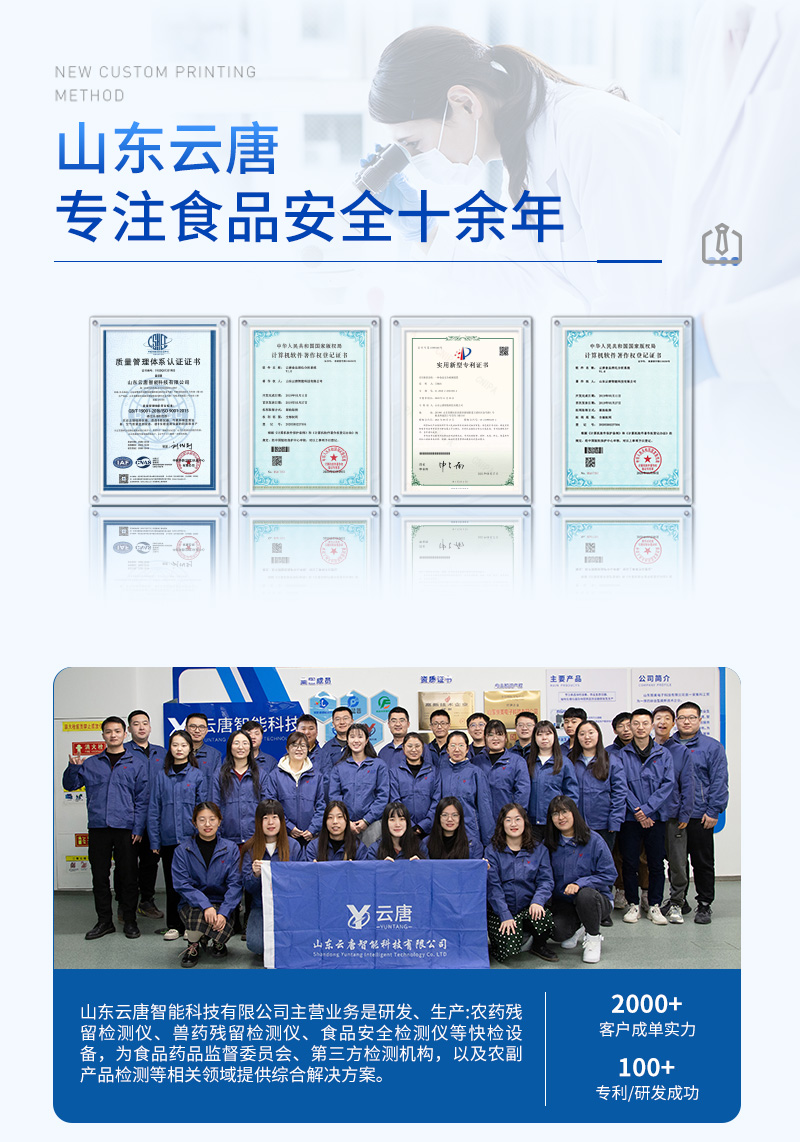 山東云唐智能科技有限公司生產(chǎn)的瘦肉精檢測儀可現(xiàn)場快速檢測鹽酸克倫特羅、萊克多巴胺、沙丁胺醇、己烯雌酚、喹乙醇等。儀器預(yù)留其他項目檢測程序和端口,根據(jù)日后需求可進行遠程設(shè)備升級。日后可升級為檢測抗生素、獸藥殘留、動物疫病等檢測項目的綜合類型儀器。 該瘦肉精檢測儀為集成化食品安全快速檢測分析設(shè)備,目前已于食藥監(jiān)局、衛(wèi)生部門、高教院校、科研院所、農(nóng)業(yè)部門、養(yǎng)殖場、屠宰場、食品肉產(chǎn)品深加工企業(yè)及檢驗檢疫部門等單位廣泛使用。