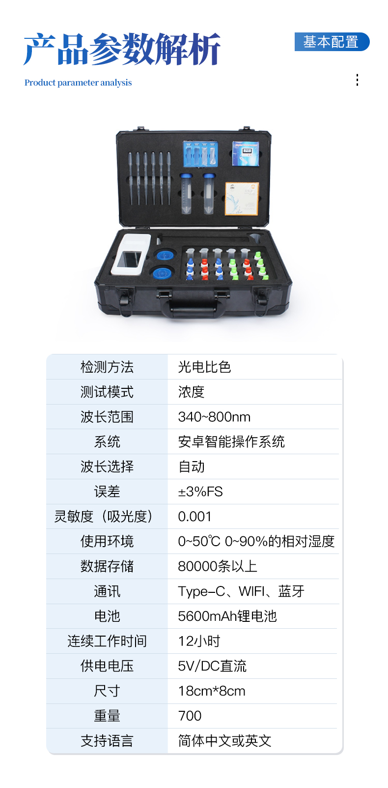 | 檢測方法:光電比色 | 測試模式:濃度 | 波長范圍:340~800nm | 系統:安卓智能操作系統 | 波長選擇:自動 | 顯示屏幕:3.5寸彩色液晶屏 | 穩定性:<0.5%<> | 靈 敏 度(吸光度):0.001 | 使用環境:0~50℃ 0~90%的相對濕度 | 數據存儲:80000條以上 | 通訊:Type-C、WIFI、藍牙 | 電池:5600mAh鋰電池 | 連續工作時間:12小時 | 供電電壓:5V/DC直流 | 尺寸:18cm*8cm | 重量:700g | 支持語言:簡體中文或英文 |