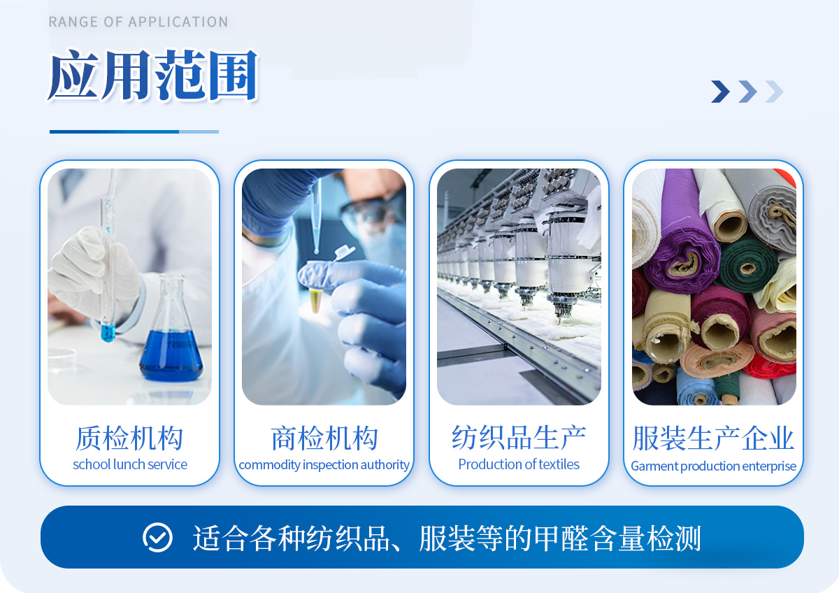 本套紡織品甲醛檢測(cè)設(shè)備滿足紡織品甲醛含量檢測(cè)的中國(guó)標(biāo)準(zhǔn)《國(guó)家紡織產(chǎn)品基本安全技術(shù)規(guī)范》(GB 18401-2010)、《紡織品·甲醛的測(cè)定·第1部分:游離和水解的甲醛(水萃取法)》(GB/T 2912.1-2009), 適合各種紡織品、服裝等的甲醛含量檢測(cè)。