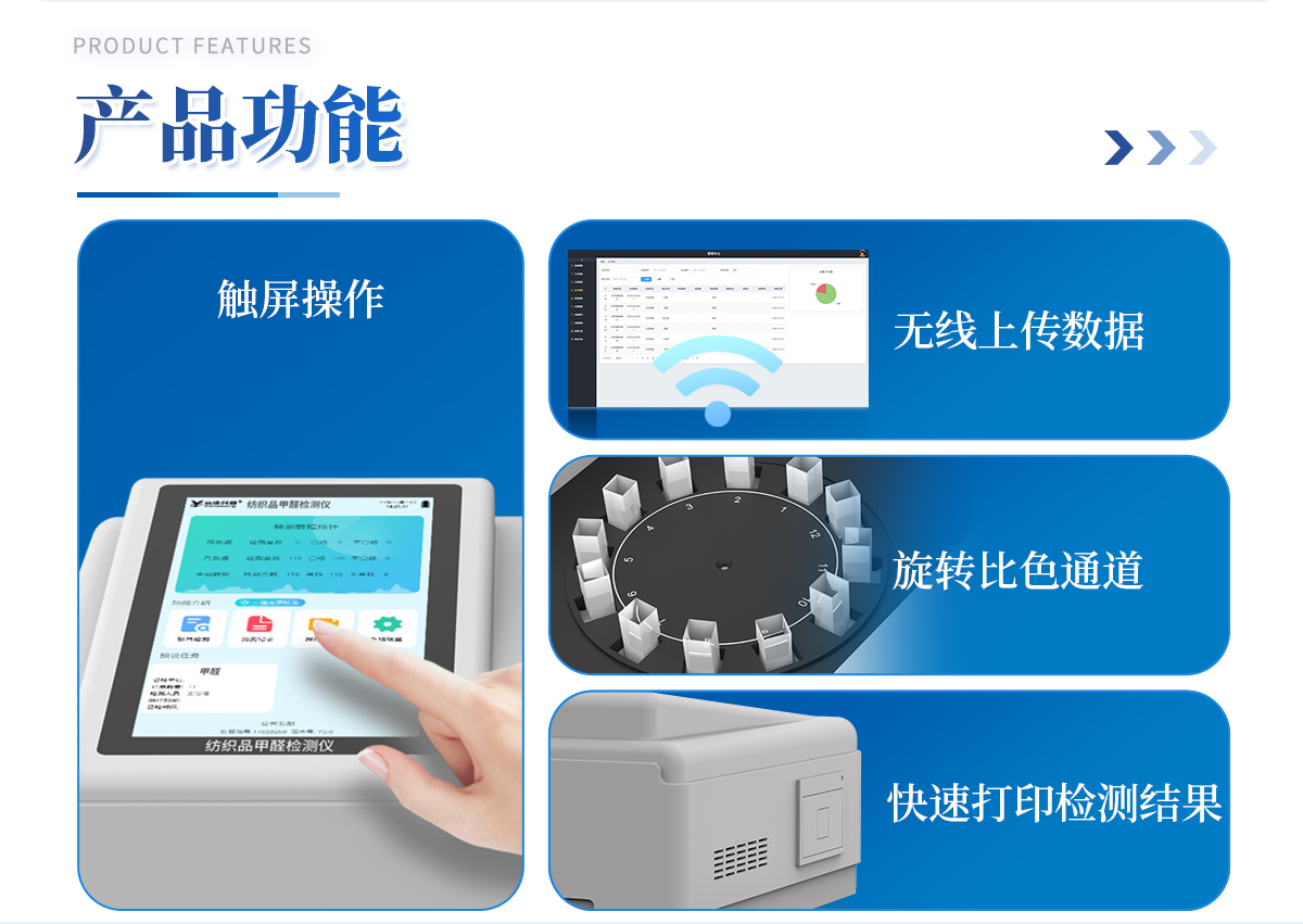 | 1、智能**且方便 | ①智能芯片:主控芯片采用ARM Cortex-A7,RK3288/4核處理器,搭配安卓智能操作系統(tǒng),集實(shí)驗(yàn)操作,分析結(jié)果,打印報(bào)告等功能于一體,使用方便,性能更強(qiáng)。 | ②大屏顯示:采用10.1英寸液晶觸摸屏,單機(jī)即可操作,無(wú)需連接外部顯示或控制器。 | ③多樣同檢:儀器具有12個(gè)檢測(cè)通道,可同時(shí)一次性檢測(cè)11個(gè)樣品,效率更高。 | ④工作預(yù)設(shè):具有任務(wù)預(yù)設(shè)模塊,一鍵提前預(yù)設(shè)樣品所有信息內(nèi)容。來(lái)樣時(shí)可直接檢測(cè),同時(shí)可多次調(diào)取。 | ⑤數(shù)據(jù)分析:設(shè)備首頁(yè)自動(dòng)匯總分析數(shù)據(jù),并繪制柱形分析圖,各項(xiàng)檢測(cè)數(shù)據(jù)一目了然,快捷直觀。 | ⑥高度集成:模塊高度集合,將分光光度模塊、數(shù)字化管理模塊、無(wú)線通訊模塊集成于一體。可將檢測(cè)結(jié)果進(jìn)行分析,直接上傳至數(shù)據(jù)平臺(tái),實(shí)現(xiàn)數(shù)據(jù)共享,方便后期進(jìn)行數(shù)據(jù)分析與統(tǒng)計(jì)。 | ⑦遠(yuǎn)程升級(jí):儀器具備遠(yuǎn)程升級(jí)功能,可遠(yuǎn)程升級(jí)程序,無(wú)需返廠,并可持續(xù)性免費(fèi)更新系統(tǒng)版本,降低成本及運(yùn)輸損耗風(fēng)險(xiǎn)。 | 2、檢測(cè)精準(zhǔn)且直觀 | ①專利技術(shù):精密旋轉(zhuǎn)比色池,使用同芯片同光源校準(zhǔn)精度,解決不同光源之間存在波長(zhǎng)誤差的問(wèn)題,更加準(zhǔn)確**。 | ②結(jié)果直觀:儀器自動(dòng)對(duì)檢測(cè)結(jié)果與國(guó)標(biāo)限量值進(jìn)行對(duì)比,自動(dòng)判定結(jié)果是否合格,結(jié)果更直觀。 | 3、功能強(qiáng)大且實(shí)用 | ①存儲(chǔ)功能:設(shè)備可以存儲(chǔ)數(shù)據(jù)100000組,可在屏幕上直觀查看歷史數(shù)據(jù),可導(dǎo)出數(shù)據(jù)。 | ②打印功能:設(shè)備自帶打印功能,可對(duì)樣品信息及檢測(cè)結(jié)果無(wú)限次隨意打印。 | ③全新方式:新創(chuàng)自定義打印方式,可按需靈活勾選控制:二維碼,抽樣信息、檢測(cè)信息,受檢信息、復(fù)核信息、抽樣日期、檢測(cè)日期等信息的打印 | ④多重編輯:樣品信息可多重編輯,可以對(duì)每個(gè)通道屬性和樣品信息單獨(dú)進(jìn)行編輯,例如樣品信息、抽樣信息、檢測(cè)信息,受檢信息、復(fù)核信息、抽樣日期、檢測(cè)日期等信息等。 | ⑤雙語(yǔ)設(shè)計(jì):全中文/英文操作菜單,簡(jiǎn)單實(shí)用,適用于不同用戶的需求。 |