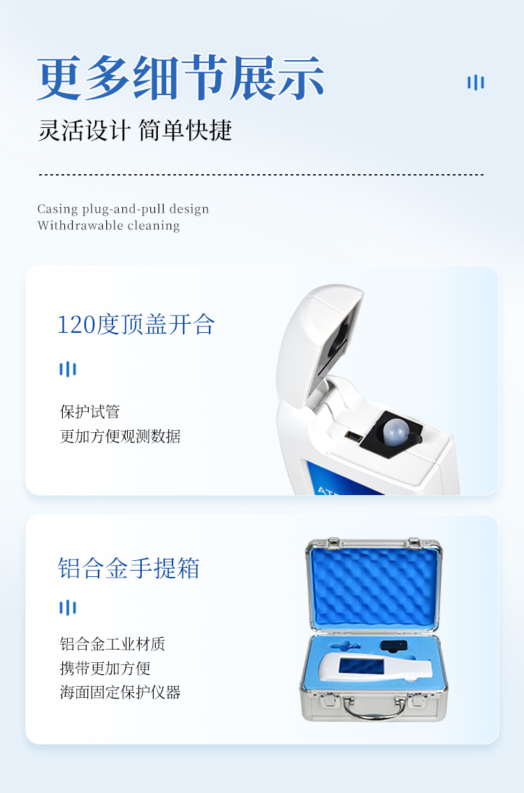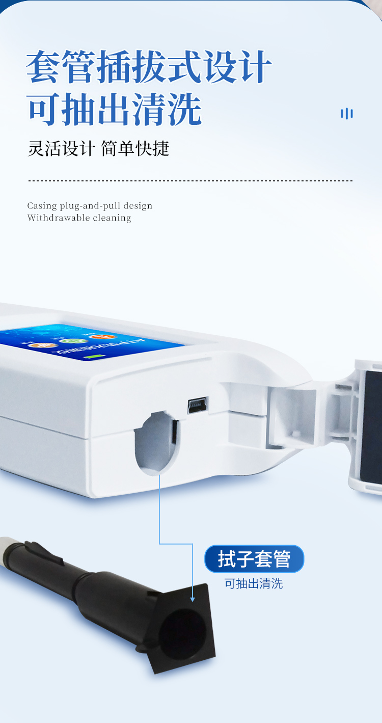 實用性 —— 可根據環境檢測需求設定上下限值,做到數據快速評估預警,表面潔凈度快速篩查。靈敏度高 —— ***************速度快 —— 常規培養法18-24h以上,而ATP只需要十幾秒鐘 .可行性 —— 微生物數量與微生物體內所含ATP有明確的相關性。 通過檢測ATP含量,可間接得出反應中微生物數量可操作性 —— 傳統培養方法需要在實驗室由經過培訓的技術人員進行操作;而ATP快速潔凈度檢測操作非常簡便,只需簡單的培訓即可由一般工作人員進行現場操作。體驗更好 —— 試子套管采用插拔式靈活設計,可定期清洗長期使用,延長儀器壽命。