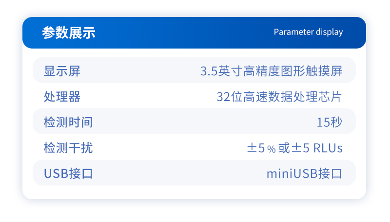 顯示屏:3.5英寸高精度圖形觸摸屏處理器:32位高速數據處理芯片檢測精度:**********大腸菌群:********檢測范圍:***************檢測時間:15秒檢測干擾:±5﹪或±5 RLUs操作溫度范圍:5℃到40℃操作濕度范圍:20—85﹪ATP回收率:90-110%檢出模式:RLU、大腸菌群篩查50個用戶ID 設定可設定的結果限值個數:251個自動判斷合格與不合格自動統計合格率內置自校光源開機30秒自檢配有miniUSB接口,可將結果上傳至PC配備專用軟件驅動U盤代替傳統光盤儀器尺寸(W×H×D):188 mm×77mm×37mm使用可充電鋰電池免電池更換備用狀態(20℃):6個月中文操作手冊穩定的液體熒光素酶潤濕的一體化采集拭子