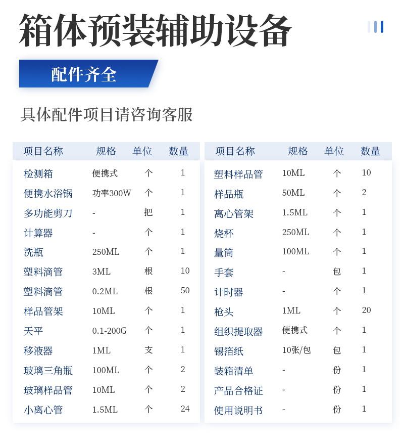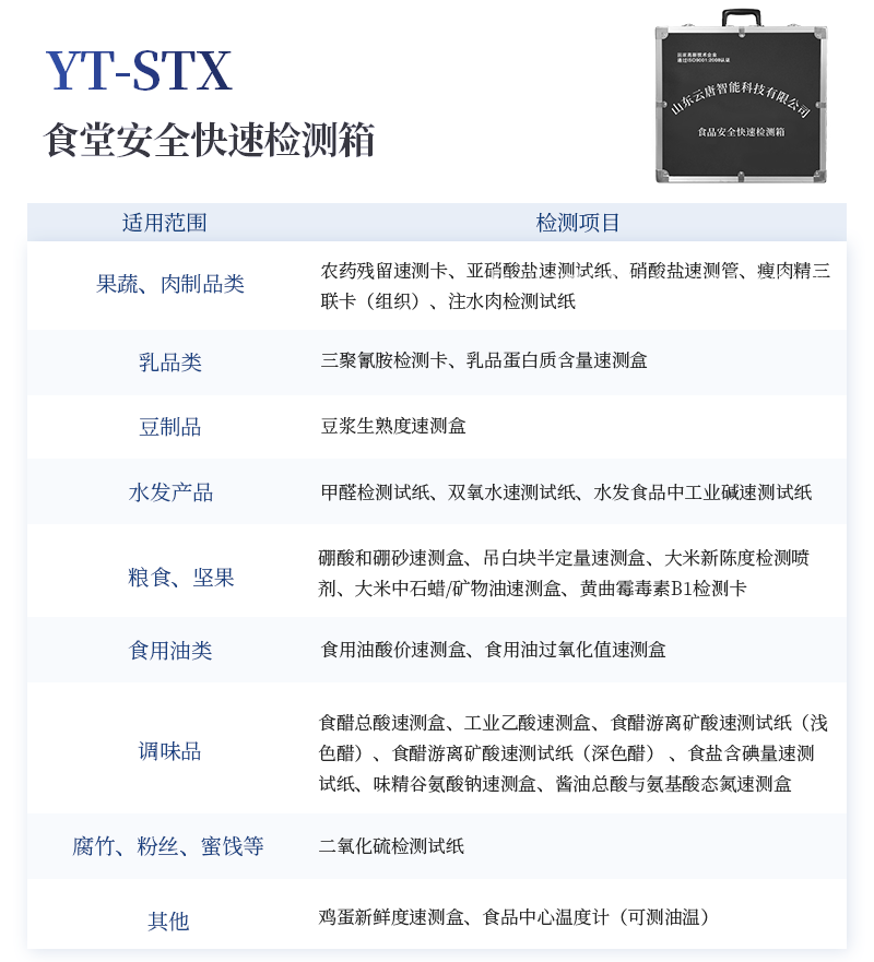 咨詢熱線:18765738993 在線咨詢技術(shù)熱線水產(chǎn)品安全快速檢測箱 序號 項(xiàng)目品 名 規(guī) 格 檢出限 單位 數(shù)量 1 箱體 食品安全快速檢測箱I 便攜式 / 個(gè) 1 2 實(shí)驗(yàn)器材 空氣吹干機(jī) 功率:450W / 個(gè) 1 微型離心機(jī) 5000轉(zhuǎn)/分鐘 / 個(gè) 1 多功能攪拌機(jī) 轉(zhuǎn)速:18000-22000轉(zhuǎn)/分鐘 / 臺 1 天平 0.1-200g / 個(gè) 1 移液器 1mL / 個(gè) 1 1ml 吸頭盒 內(nèi)含吸頭 / 個(gè) 1 多功能剪刀 - / 個(gè) 1 樣品管架 10ml / 個(gè) 1 計(jì)時(shí)器 - / 個(gè) 1 塑料樣品管 10ml / 個(gè) 20 小離心管 1.5ml / 個(gè) 50 3 水產(chǎn)品安全快速檢測卡 氯霉素檢測卡 10次/盒 0.3ppb 盒 1 磺胺類檢測卡 10次/盒 20ppb 盒 1 孔雀石綠檢測卡 10次/盒 2ppb 盒 1 呋喃西林檢測卡 10次/盒 0.5ppb 盒 1 呋喃妥因檢測卡 10次/盒 0.5ppb 盒 1 呋喃唑酮檢測卡 10次/盒 0.5ppb 盒 1 呋喃它酮檢測卡 10次/盒 0.5ppb 盒 1 4 裝箱清單 —— —— —— 份 1 5 產(chǎn)品合格證 —— —— —— 份 1 6 使用說明書 —— —— —— 份 1 |