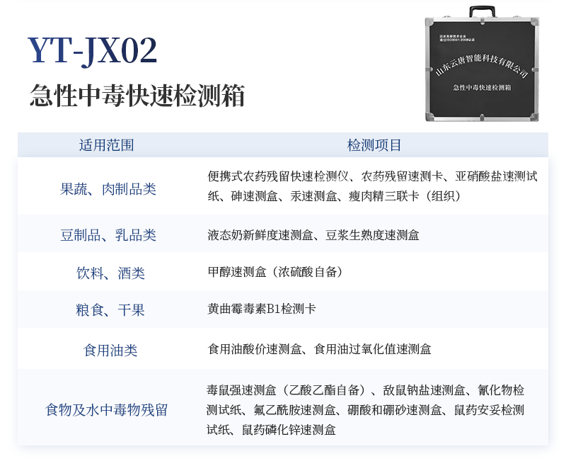 水產品安全快速檢測箱 序號 適用范圍 檢測項目 規格 單位 數量 檢測限 檢測范圍 1 果蔬、肉制品類 農藥殘留速測卡 20次 盒 5 0.3-3.5mg/kg / 亞硝酸鹽速測試紙 20條 套 1 2mg/kg 0-40mg/kg 硝酸鹽速測管 20次 盒 1 0.5mg/kg 0.5-10mg/kg(以N計) 瘦肉精三聯卡(組織) 各10次 包 1 鹽酸克倫克羅、萊克多巴胺3ppb,沙丁胺醇5ppb / 注水肉檢測試紙 50條 袋 1 定性 / 2 乳品類 三聚氰胺檢測卡 10條 包 1 100ppb / 乳品蛋白質含量速測盒 25次 盒 1 牛乳:1% 奶粉:5% 牛乳0-5%; 乳粉0-25% 3 豆制品 豆漿生熟度速測盒 50次 盒 1 定性 / 4 水發產品 甲醛檢測試紙 20條 套 1 10mg/kg / 雙氧水速測試紙 20條 套 1 5mg/kg 0-30mg/kg 水發食品中工業堿速測試紙 20條 套 1 0.4g/L / 5 糧食、堅果 硼酸和硼砂速測盒 100次 盒 1 25mg/kg 定性 吊白塊半定量速測盒 100次 盒 1 2.5mg/kg 0-100mg/L 大米新陳度檢測噴劑 50次 盒 1 定性 / 大米中石蠟/礦物油速測盒 100次 盒 1 1.00% / 黃曲霉毒素B1檢測卡 10次 包 1 0.5ppb / 6 食用油類 食用油酸價速測盒 100次 盒 1 1mg/kg 0-8mg/kg 食用油過氧化值速測盒 100次 盒 1 0.09g/100g 0.09-0.45g/100g 7 調味品 食醋總酸速測盒 20次 盒 1 0.26g/100mL / 工業乙酸速測盒 100次 盒 1 定性 / 食醋游離礦酸速測試紙(淺色醋) 20條 套 1 0.50% / 食醋游離礦酸速測試紙(深色醋) 20條 套 1 0.50% / 食鹽含碘量速測試紙 20條 套 1 15mg/kg 0-40mg/kg 味精谷氨酸鈉速測盒 15次 盒 1 2.60% / 醬油總酸與氨基酸態氮速測盒 20次 盒 1 總酸: 0.45g/100mL氨基酸態氮:0.078g/100mL / 8 腐竹、粉絲、蜜餞等 二氧化硫檢測試紙 20條 套 1 15mg/kg 0-150mg/kg 9 其他 雞蛋新鮮度速測盒 10次 盒 1 定性 / 食品中心溫度計(可測油溫) -50~300℃ 支 1 / / 10 箱體預裝輔助設備 食品安全快速檢測箱I 便攜式 個 1 / / 便攜水浴鍋 功率300W 個 1 多功能剪刀 - 把 1 計算器 - 個 1 洗瓶 250ml 個 1 塑料滴管 3ml 根 10 塑料滴管 0.2ml 根 50 樣品管架 10ml 個 1 天平 0.1-200g 個 1 移液器 1mL 支 1 玻璃三角瓶 100ml 個 2 玻璃樣品管 10ml 個 2 小離心管 1.5ml 個 24 塑料樣品管 10ml 個 10 樣品瓶 50ml 個 2 離心管架 1.5ml 個 1 燒杯 250ml 個 1 量筒 100ml 個 1 手套 - 包 1 計時器 - 個 1 槍頭 1ml 個 20 組織提取器 便攜式 個 1 錫箔紙 10張/包 包 1 裝箱清單 - 份 1 產品合格證 - 份 1 使用說明書 - 份 1 |