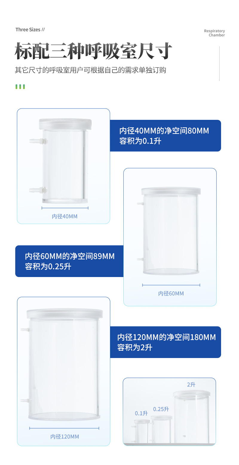 | 測量范圍:0-100% 分辨率:0.1% 精度:±0.2%F.S | 電 源:AC220V±10% | 預熱時間:30分鐘 | 標配三種呼吸室尺寸: | 1、內徑40mm的凈空間80mm 容積為0.1升 | 2、內徑60mm的凈空間89mm 容積為0.25升 | 3、內徑120mm的凈空間180mm 容積為2升 | 其它尺寸的呼吸室用戶可根據自己的需求單獨訂購 |