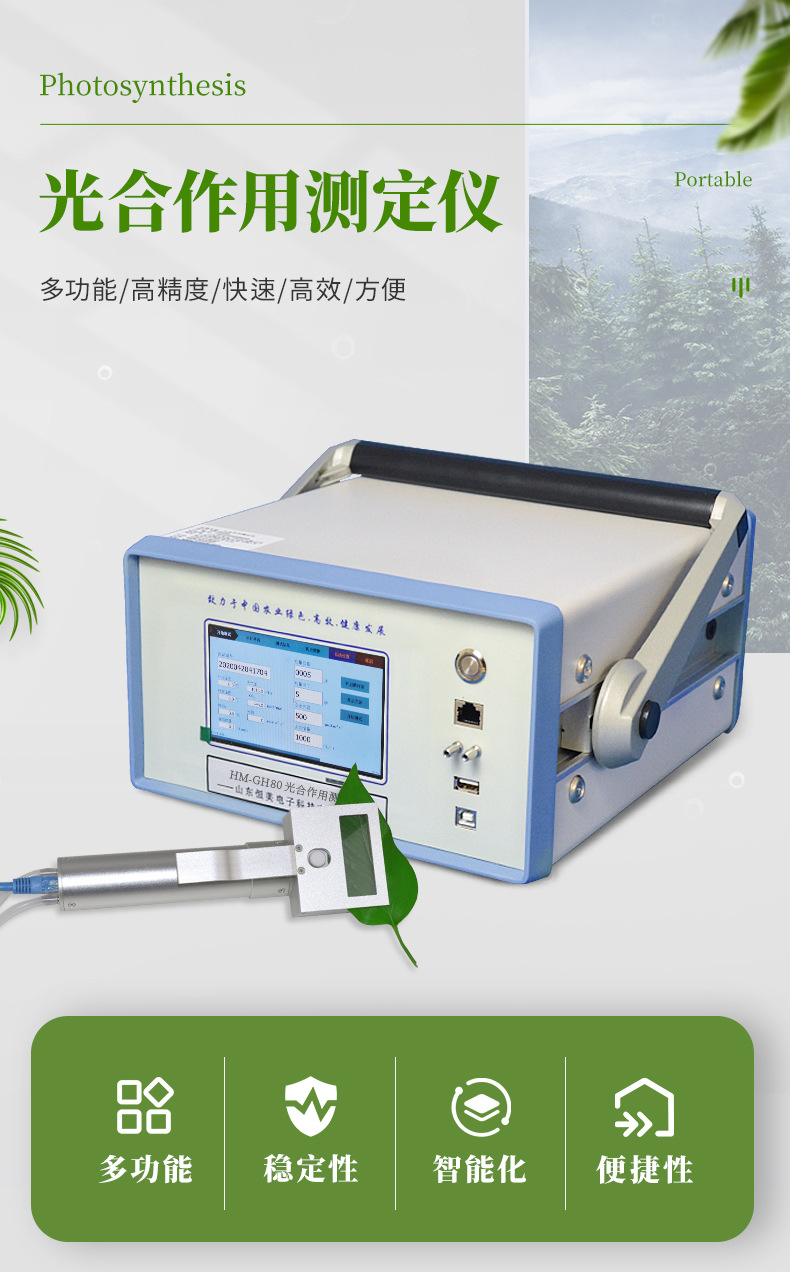 光合作用測定儀是通過測量植物葉片一定時間內CO2吸收(釋放)的量, 并同時測量空氣溫濕度,葉片溫度,光照強度以及同化CO2的葉片面積等要素,就可以直接計算出植物的光合速率、蒸騰速率、細胞間CO2濃度和氣孔導度等光合作用指標。該儀器具有靈敏度高、反應迅速,抗干擾性強,操作方便,可以進行活體的、連續的測定等突出優點,因而被廣泛應用于植物生理學、植物生物化學、生態環境、農業科學等多個領域。