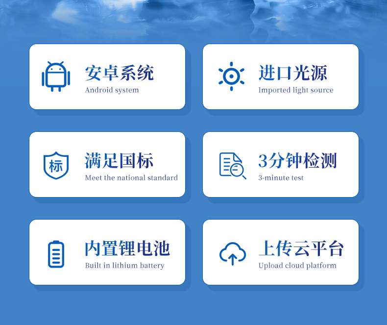 | 可檢測(cè)PH、溶解氧、氨氮、亞硝酸鹽、總堿度、硫化氫、鹽度、磷酸鹽、總硬度9項(xiàng)指標(biāo); | Android智能系統(tǒng)操作更佳簡(jiǎn)便快捷 | 內(nèi)置操作流程、操作簡(jiǎn)單、無(wú)需培訓(xùn)、直接上手; | 檢測(cè)速度快,現(xiàn)場(chǎng)讀取數(shù)據(jù); | 便攜式體積小,重量輕,方便戶(hù)外檢測(cè) | 外形小巧美觀,工作穩(wěn)定免維護(hù),具有較好的性?xún)r(jià)比 | 采用進(jìn)口冷光源,光學(xué)性能穩(wěn)定,壽命長(zhǎng)達(dá)10萬(wàn)小時(shí) |