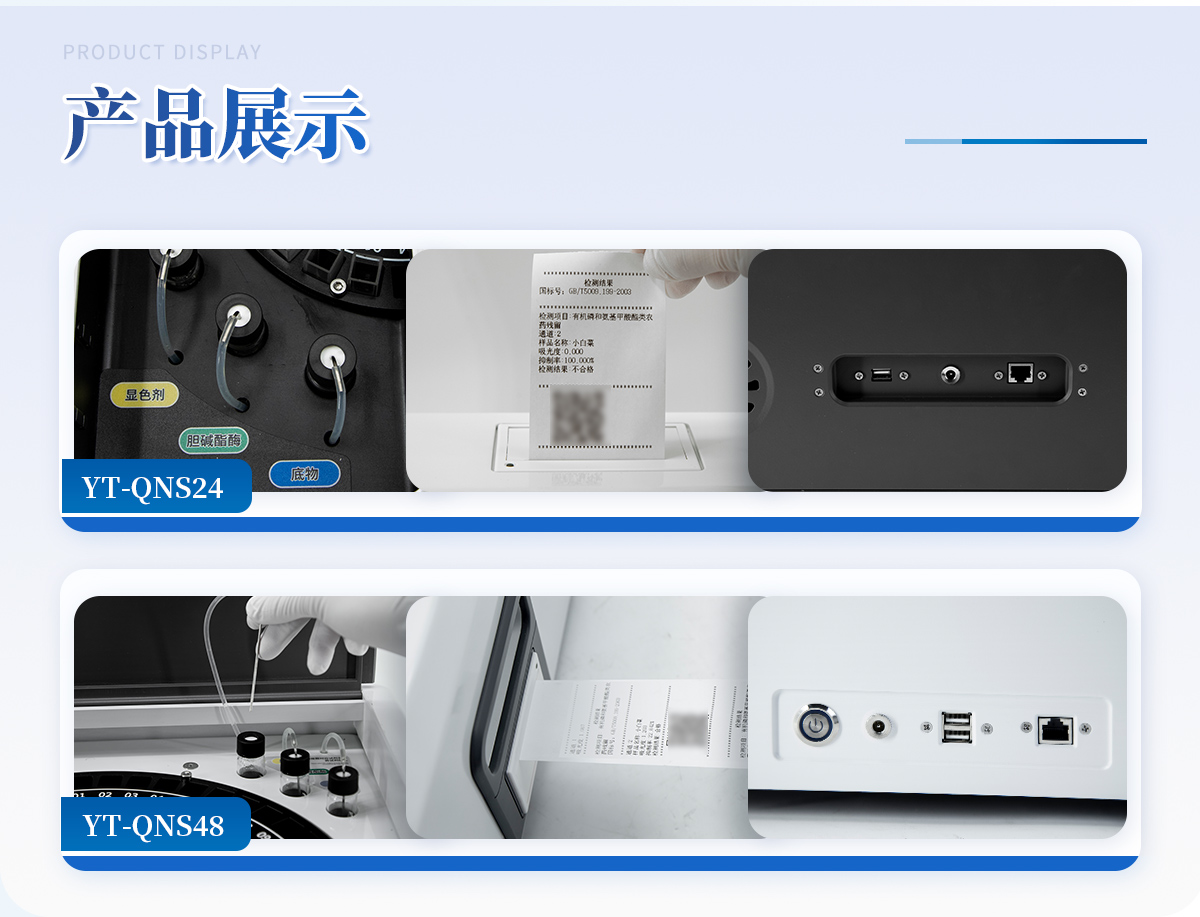 | 1. 試劑位置:3個 | 2. 農殘檢測盤:旋轉24通道比色盤,可任意選擇檢測通道,自動對應選擇通道。 | 3. 膠體金通道:2個,可讀取檢測卡結果,自動采集、處理分析,自動判斷檢測結果,并具備自動判空功能。 | 4.系統配置:10.1寸高清液晶觸摸屏,采用ARM Cortex?-A7,RK3288/4核處理器,運行內存1GB。Android7.1.1 系統分辨率1280×800。 | 5.恒溫系統:具有自動加溫溫控系統,精準恒溫37℃,精度±0.1℃。 | 6.添加系統:儀器按照試劑要求自動、按時、按量加入試劑,并且自動對未正常放置的樣本或異常的樣本進行檢查并提示。 | 7.清洗功能:儀器具備回流及自動清洗管路功能,避免試劑污染。 | 8.混勻功能:設備具備自動混勻功能。 | 9.光源校準:設備可自動校準,確保檢測準確度。 | 10.實時監控:儀器測試過程中屏幕顯示運行狀態,可實時查看。 | 11.數據存儲:內部存儲16GB,可存儲500萬條數據。 | 12.樣品多選功能:設備具備樣品一鍵多選功能,選擇樣品自動匹配檢測通道。 | 13.項目預設:可提前設置單個及多個相同或不相同的檢測任務,可單次或者多次調取,減少檢測時間。 | 14.自定義打印系統:內置自定義打印系統,可按需靈活設置開啟或關閉:產品合格證(國家農業部標準),二維碼,抽樣信息、檢測信息,受檢信息等信息的打印。 | 15.A4版本報告打印功能:設備可自動生成A4版報告,A4報告帶二維碼,可掃描二維碼生成電子版,并可識別真偽。 | 16.傳輸方式:儀器配備無線通信模塊: 4G(APN)通訊模塊、Wifi模塊,藍牙傳輸模塊,同時具有USB接口以及RJ45接口能以多種方式實現數據保存和數據傳輸功能,設備數據可以同步上傳至平臺。 | 17.系統17.數據監管系統:設備自帶監管平臺,并可同步對接監管平臺,數據可局域網和互聯網數據上傳,檢測結果可直接傳至食品安全監管平臺。達到食品安全問題預估、預警。 | 18.系統遠程更新功能:無需設備返廠,即可遠程實時升級全新系統,節省時間成本及避免運輸造成設備損。 |