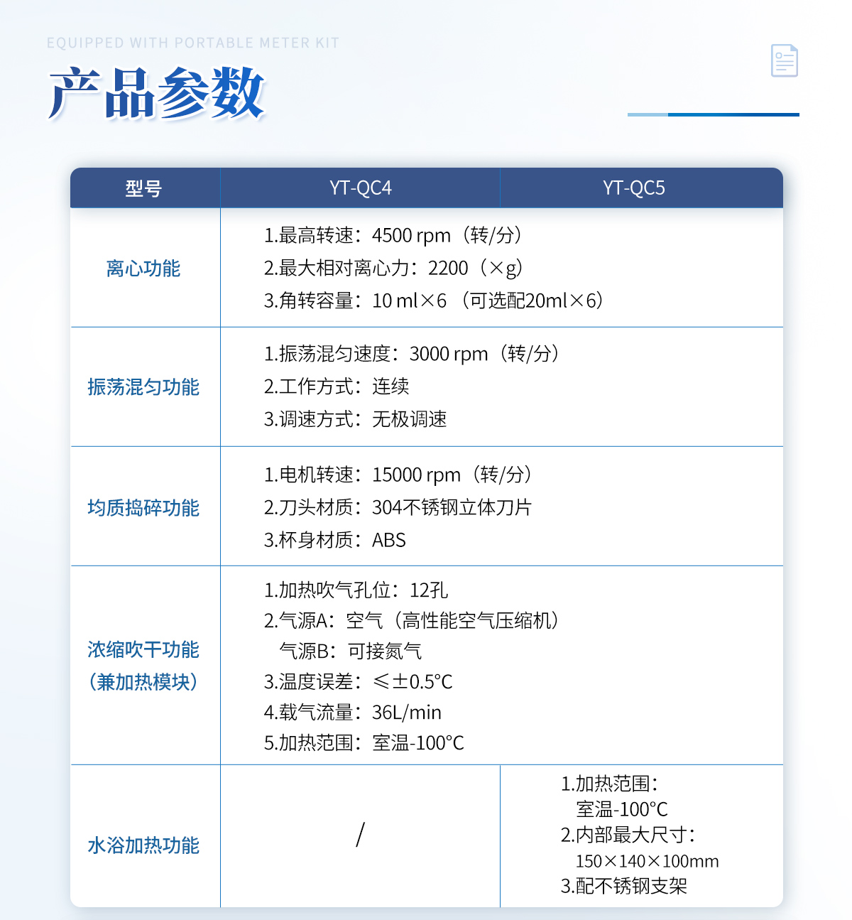 產品描述:產品介紹: QC4型四合一樣品檢測前處理一體機(箱)是集吹干、離心、均質、混勻功能的一體化整合,極大的簡化和集中樣品前處理的一般操作過程,結合移動便攜的工程塑料箱體,特別適合農獸藥殘留畜禽水產品質量安全現場快速檢測。 內置一體化儀器配置表:【詳情】  更新時間:2026-04-07