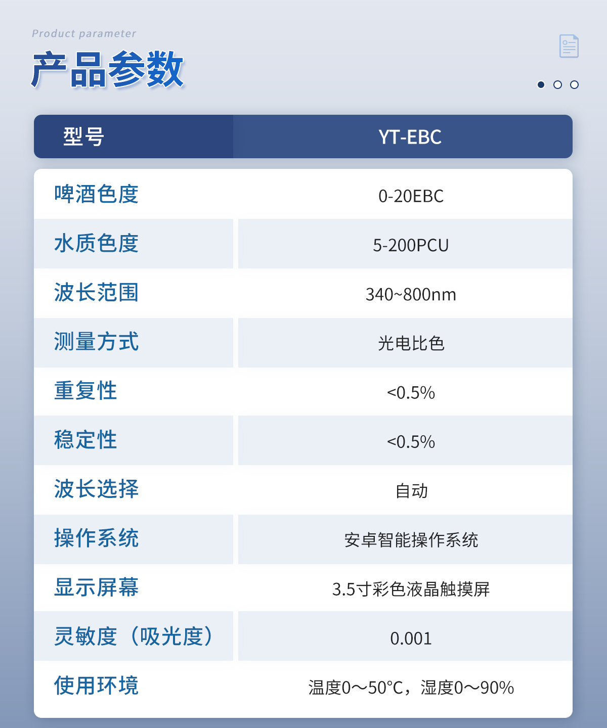 產(chǎn)品描述:產(chǎn)品簡介:啤酒色度測定儀采用鉑-鈷標準色度法,用于測定溶解狀態(tài)的物質所產(chǎn)生的顏色,儀器采用國家標準GB5750中所規(guī)定的鉑-鈷色度標準溶液進行標定,采用鉑-鈷色度作為計量單位。本儀器采用光電比色原理取代傳統(tǒng)的目視比色法。消除了人為誤差,因此測量分辨率大大提高。測量時,把被測水樣放入光電比色池,儀表會直接讀取數(shù)【詳情】  更新時間:2026-03-31