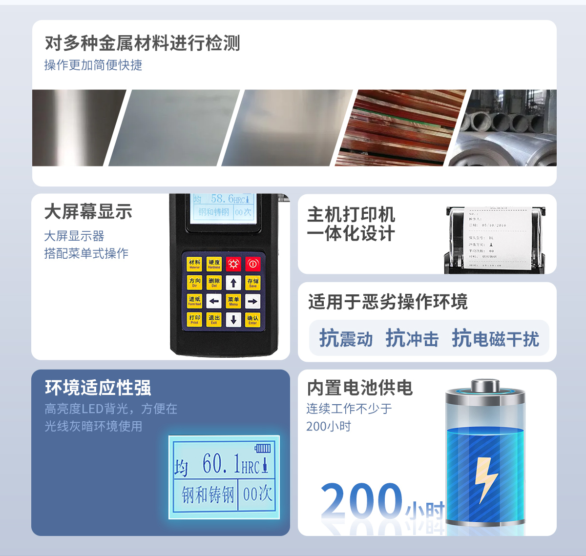 ● 里氏(HL)、布氏(HB)、洛氏(HRC/HRB/HRA)、維氏(HV)、肖氏(HS)等7種硬度值實現測量,自動轉換;