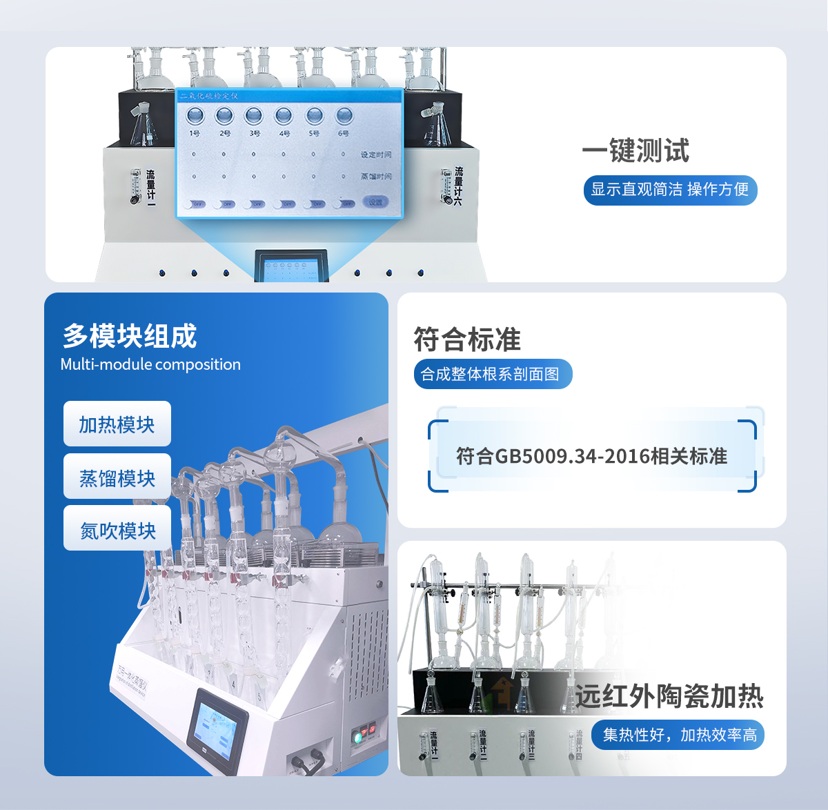 中藥二氧化硫殘留量測定儀主要由加熱模塊,蒸餾模塊,冷卻循環水模塊以及氮吹模塊組成。加熱模塊設置了高,中,低三檔加熱速率控制功能,可實現加熱效率的**控制面板;蒸餾模塊選用高硼硅材料,耐熱性好,堅固耐用;冷卻水循環系統可選用外置冷卻水循環機(內置可選),確保冷卻效果。氮吹模塊可外接氮氣發生器或氮氣鋼瓶,并配有高精度氣體流量計,嚴格控制氮吹速率