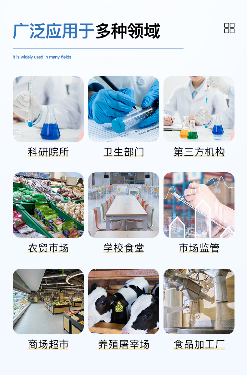 多功能食品安全檢測儀可快速檢測200多項目,包含非食用化學物質、濫用食品添加劑、農藥殘留、獸藥殘留、重金屬、病害肉、營養強化劑、抗生素類殘留、激素類殘留、真菌毒素類殘留、化學類殘留等現場的定性定量檢測。該多功能食品安全檢測儀為集成化食品安全快速檢測分析設備,廣泛應用于市場監管局、檢測中心、衛生監督部門、農業部門、院校及各單位食堂、食品肉產品深加工企業、商超市場、司法部門、餐飲機構、養殖場、屠宰場、檢驗檢疫部門等單位使用。