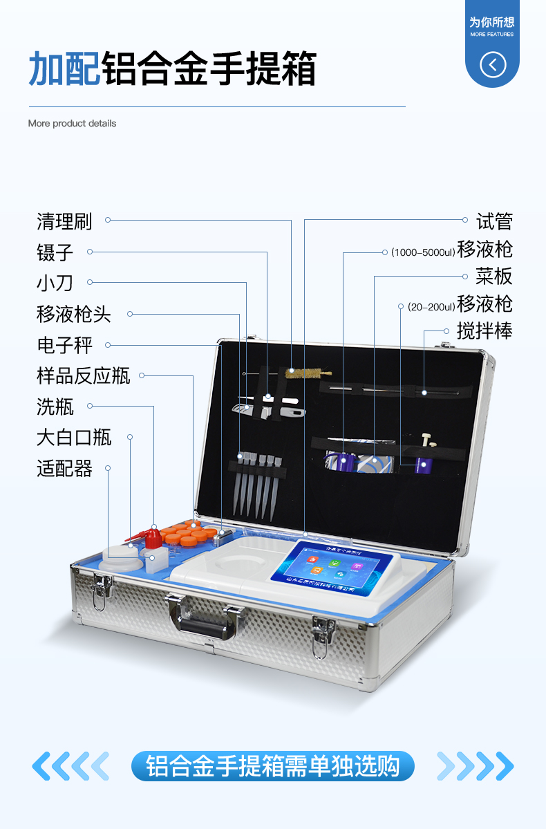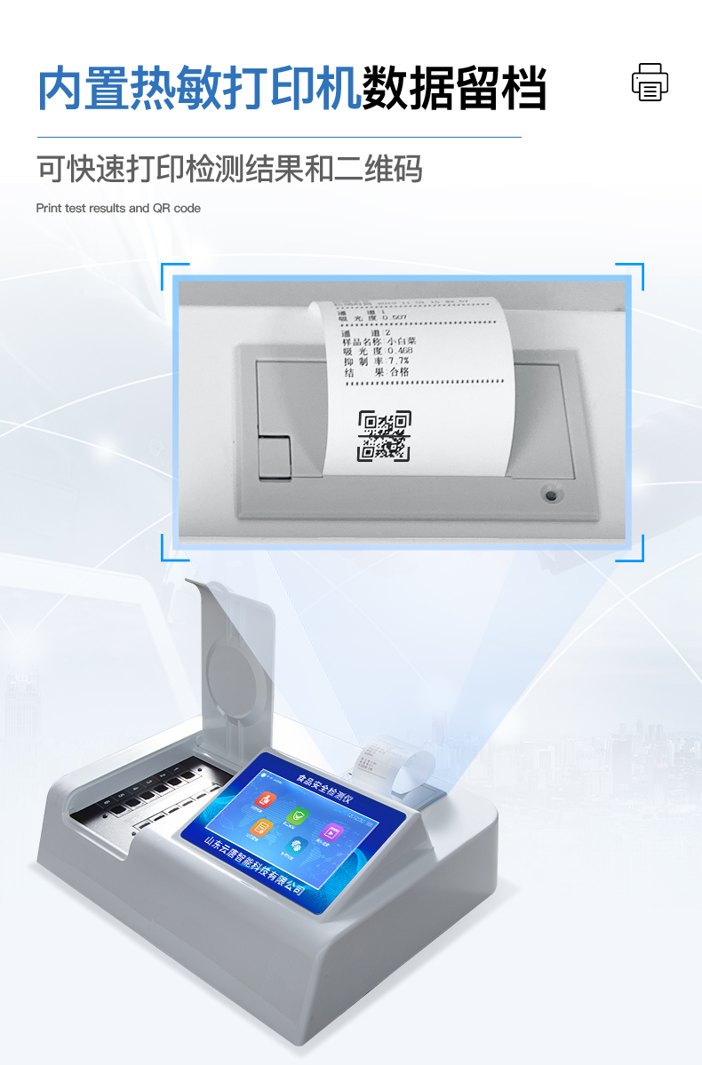 | 安卓智能操作系統,采用更加**和人性化操作,儀器具有網線連接、wifi聯網上傳、GPRS無線遠傳功能,快速上傳數據。 | 智能化程度高,儀器具有自檢功能:具有開機自檢和調零功能,具有自動檢測重復性功能。 | 檢測通道:≥12個檢測通道,可以同時測試多個樣品,每個樣品由程序控制分別獨立工作,不會互相干擾。 | 顯示方式:≥8英寸液晶觸摸屏顯示,人性化中文操作界面,讀數直觀、簡單。 | 配備新一代嵌入式熱敏打印機,可選擇手動打印或者自動打印,檢測完成可自動打印檢測報告和二維碼。 | 光源采用進口超高亮發光二極管,高精度、穩定性強、光源可控、可以關掉不使用的光源,功耗更低。 | 采用USB2.0接口設計,方便數據的存貯和移動,并可隨時與計算機直接相連,并且可用計算機控制儀器。實現數據查詢、瀏覽、分析、統計、打印等。 | 儀器帶有監管平臺。數據可局域網和互聯網數據上傳,檢測結果直接傳至食品安全監管平臺。進行區域食品安全監管及大數據分析處理,檢測區域食品安全長短期動態,達到食品安全問題預估、預警 | 一體化便攜式快檢設備,滿足現場及流動檢測使用需求,能夠在同一軟件下實現所有檢測項目的檢測,并可通過同一窗口直觀顯示檢測結果。 | 儀器具有多品類多種類樣品菜單庫,可靈活選擇檢測樣品,不同的檢測通道可同時檢測不同的樣品項目。也可在儀器上直接編輯錄入樣品名稱、檢測指標、送檢單位等信息并保存進樣品數據庫。 | 樣品處理簡單省力,整體操作快速、安全、便捷。 | 儀器具有自身保護功能,可設置用戶名及密碼,防止非工作人員操作等。 | 高靈敏度,高檢測精度,高重復性精度,掃描式高精度光學傳感器。 | 儀器具有重新校準、鎖定、恢復出廠設置功能。 | 支持U盤存儲。 結果判定線可修改,對照值標定值可保存,斷電不丟失數據。 |
